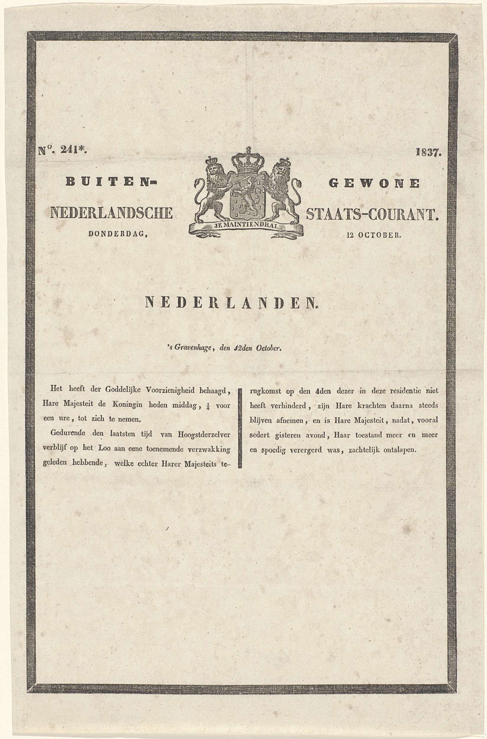 Dood van Neêrlands Koningin. 's Gravenhage den 12 oc...