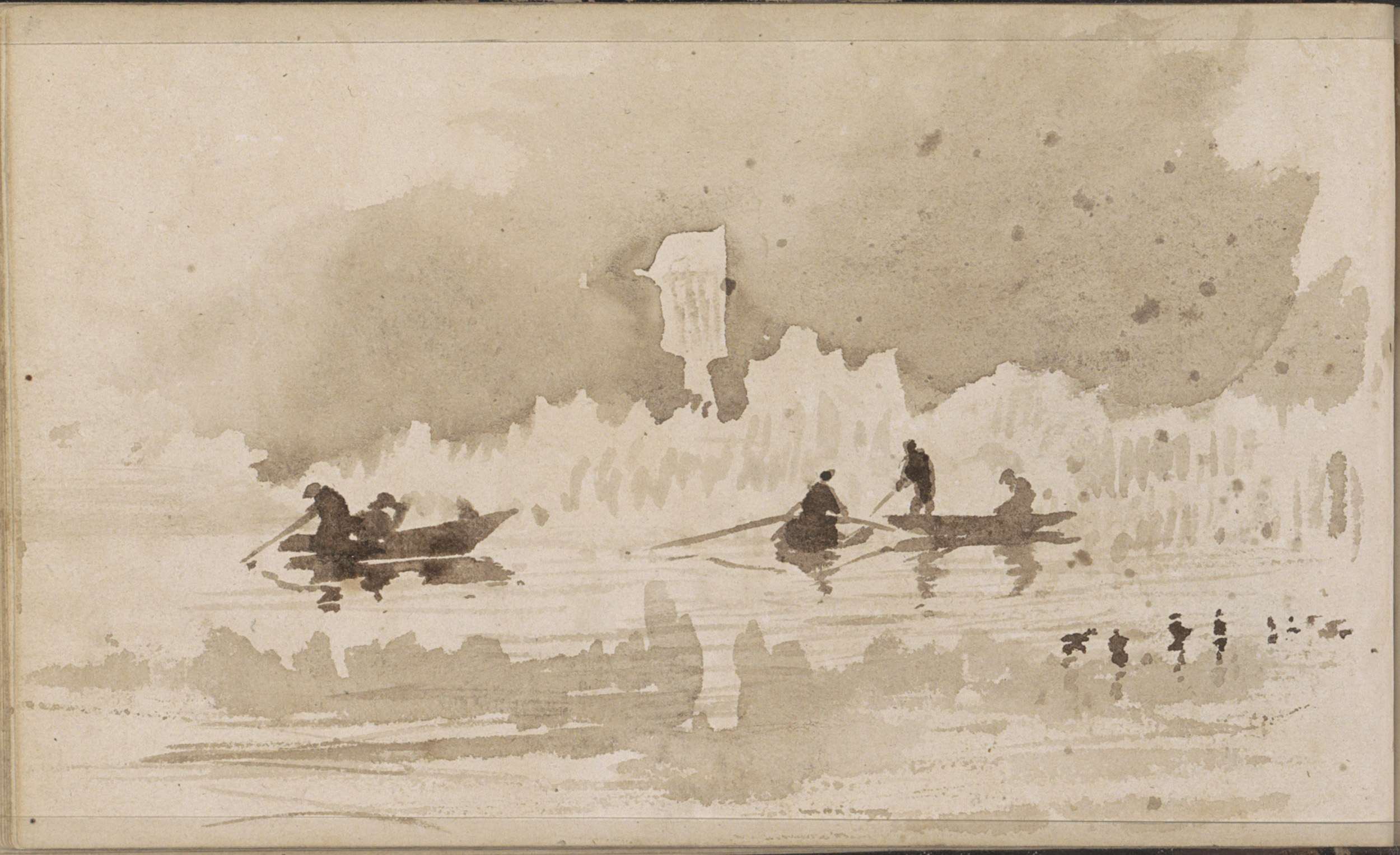 Rivier met figuren in roeiboten