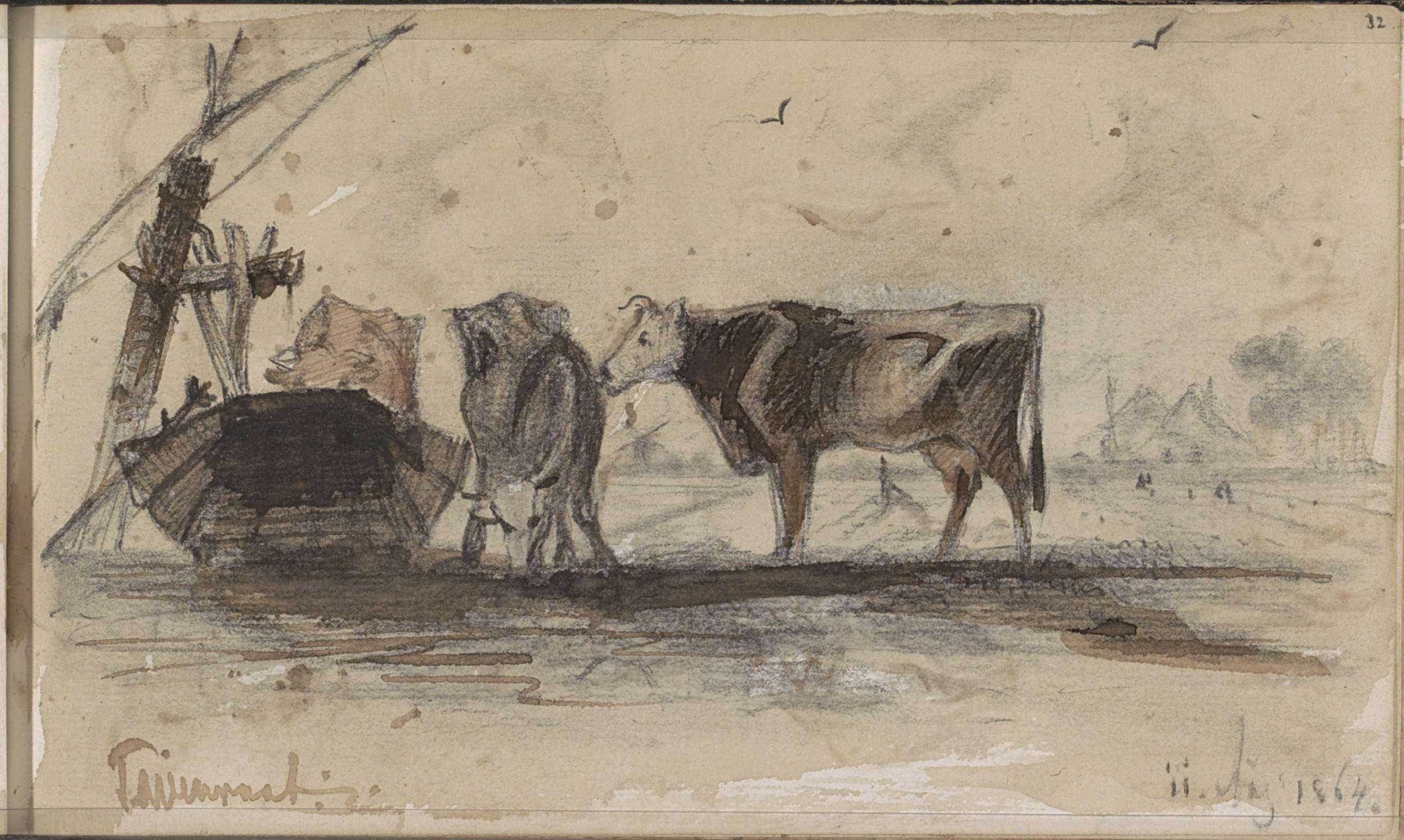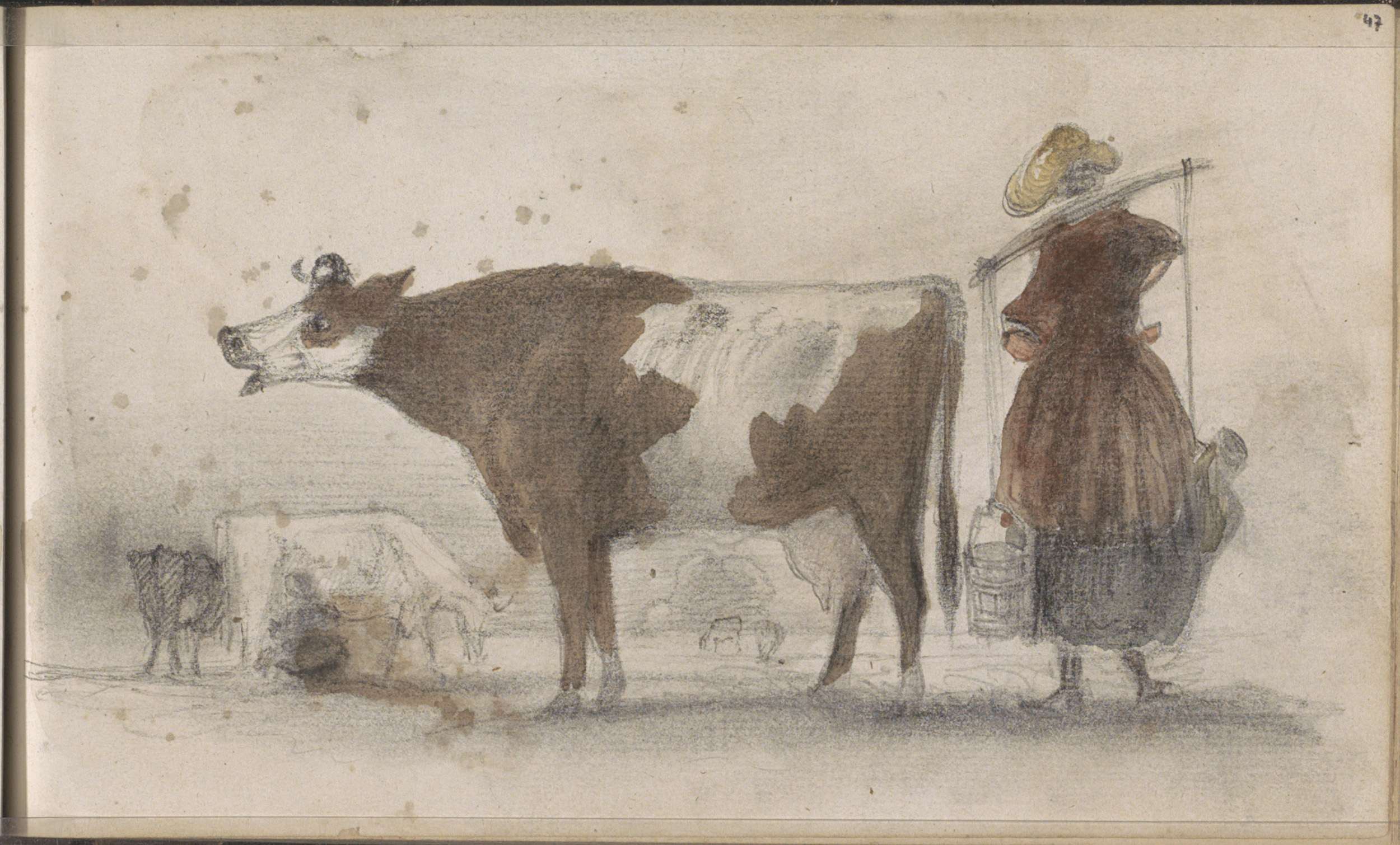 Weiland met koeien en een boerin met een juk