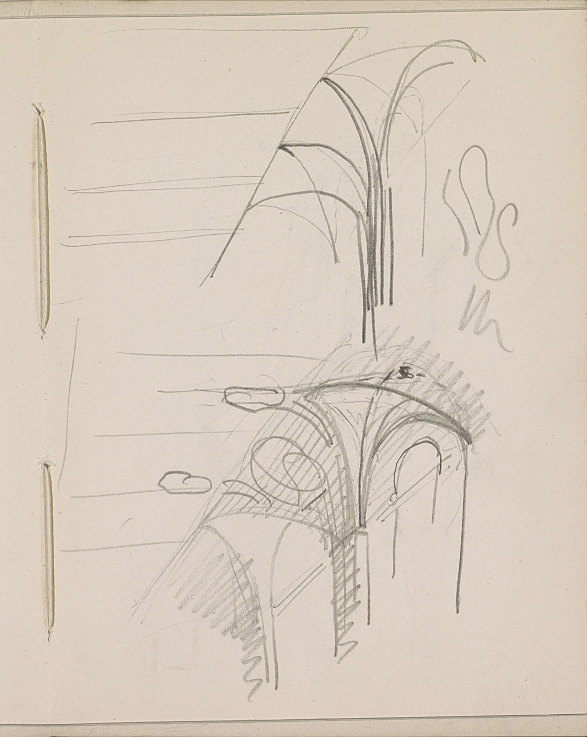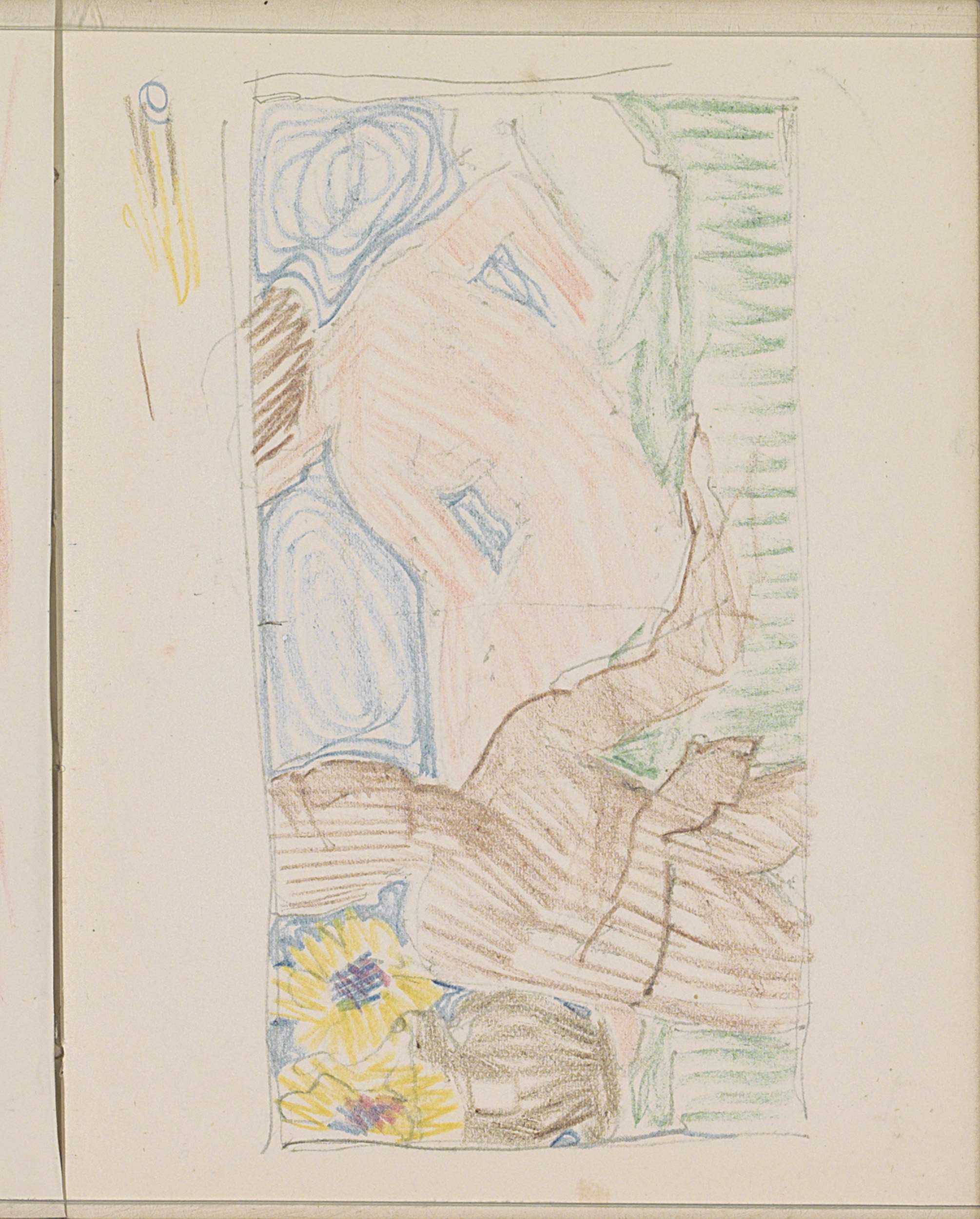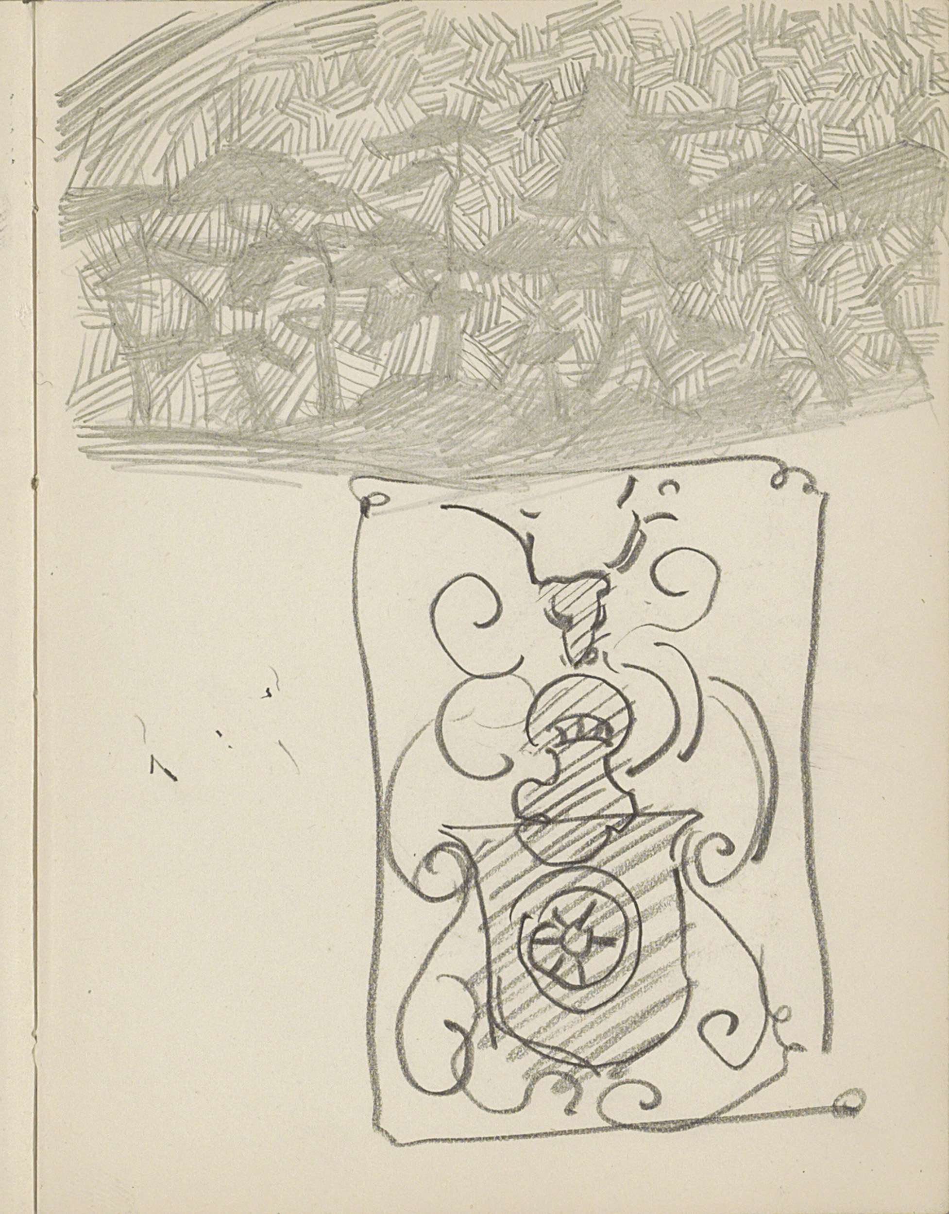 Zittende naakte figuur naast een vaas met bloemen