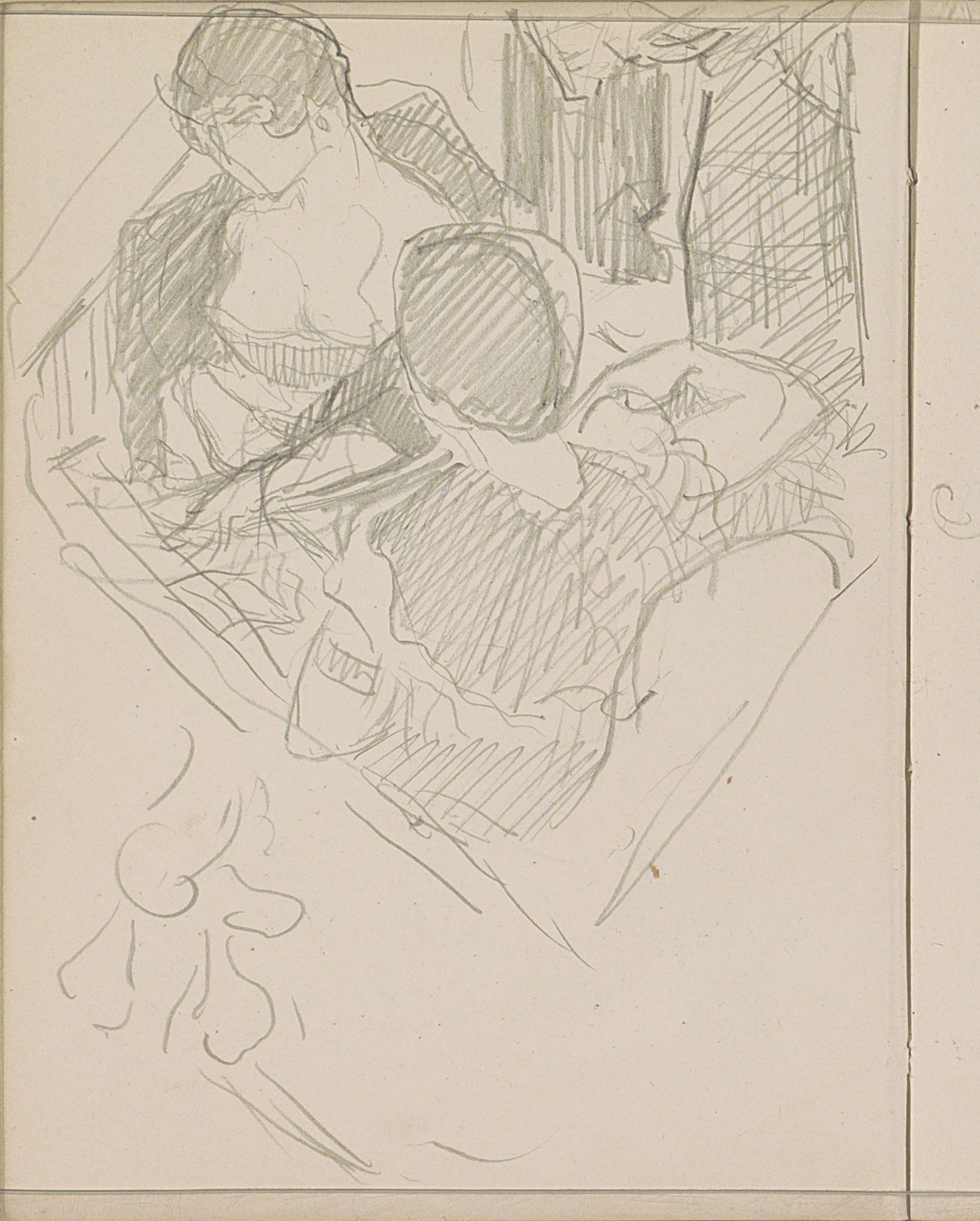 Zittende man naast een liggende naakte vrouw op een bed