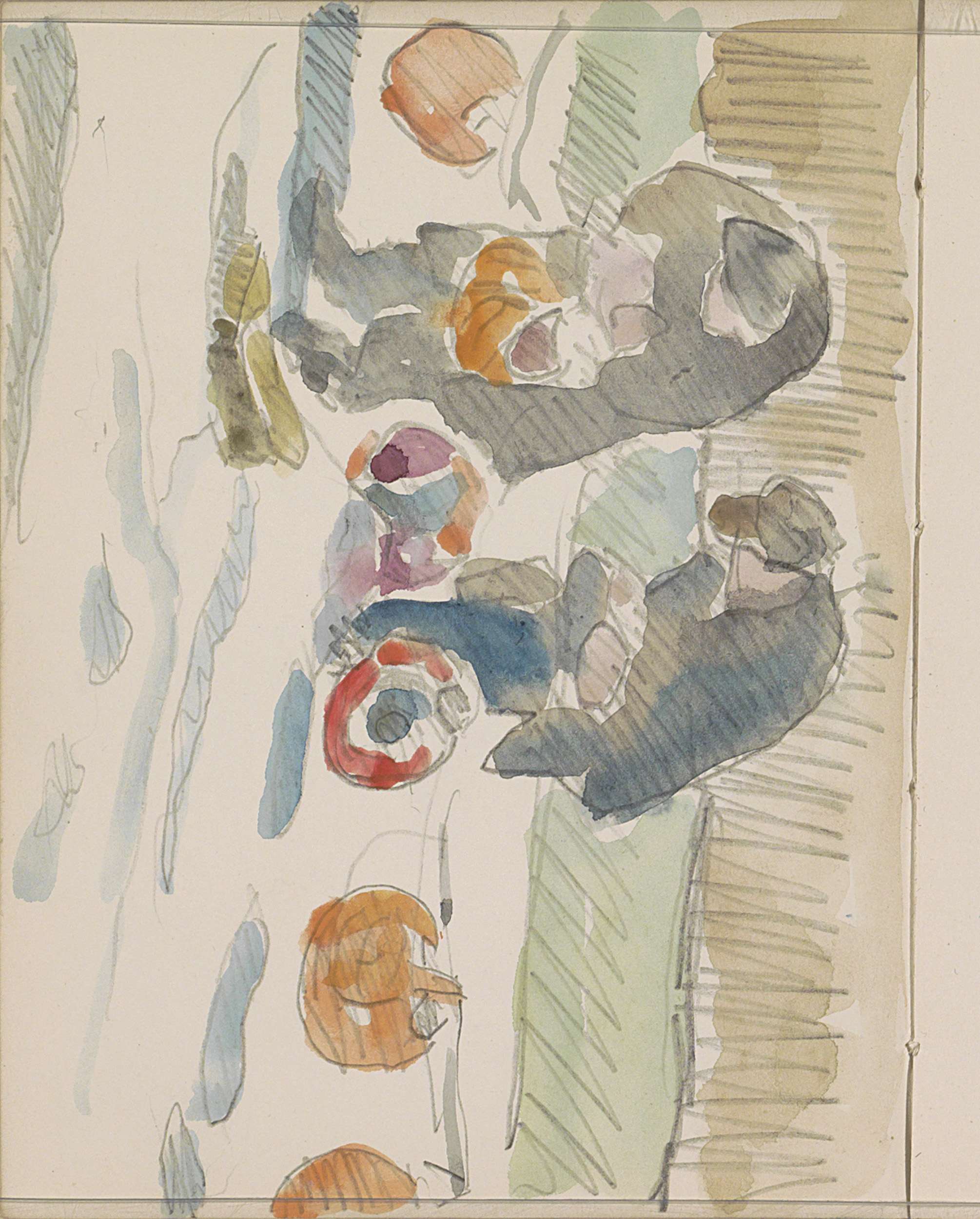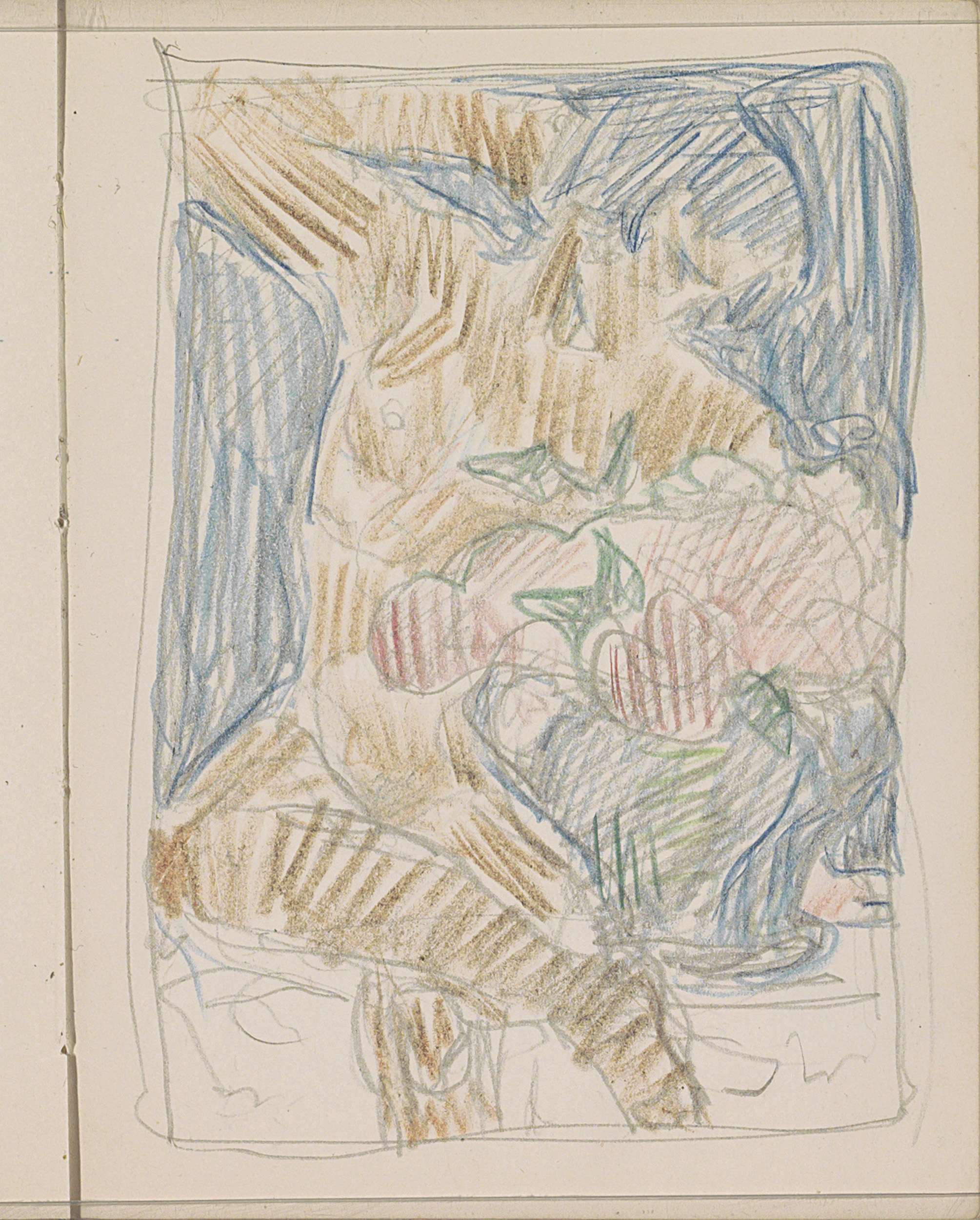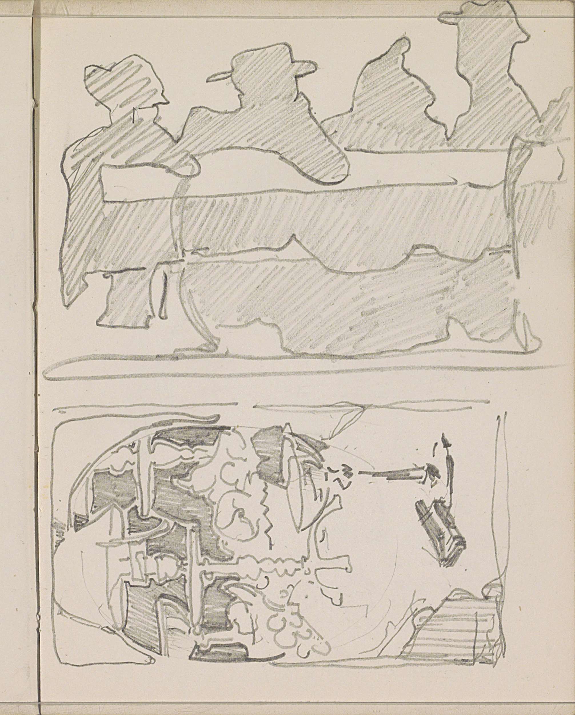 Vier figuren zittend op een bank en een stilleven