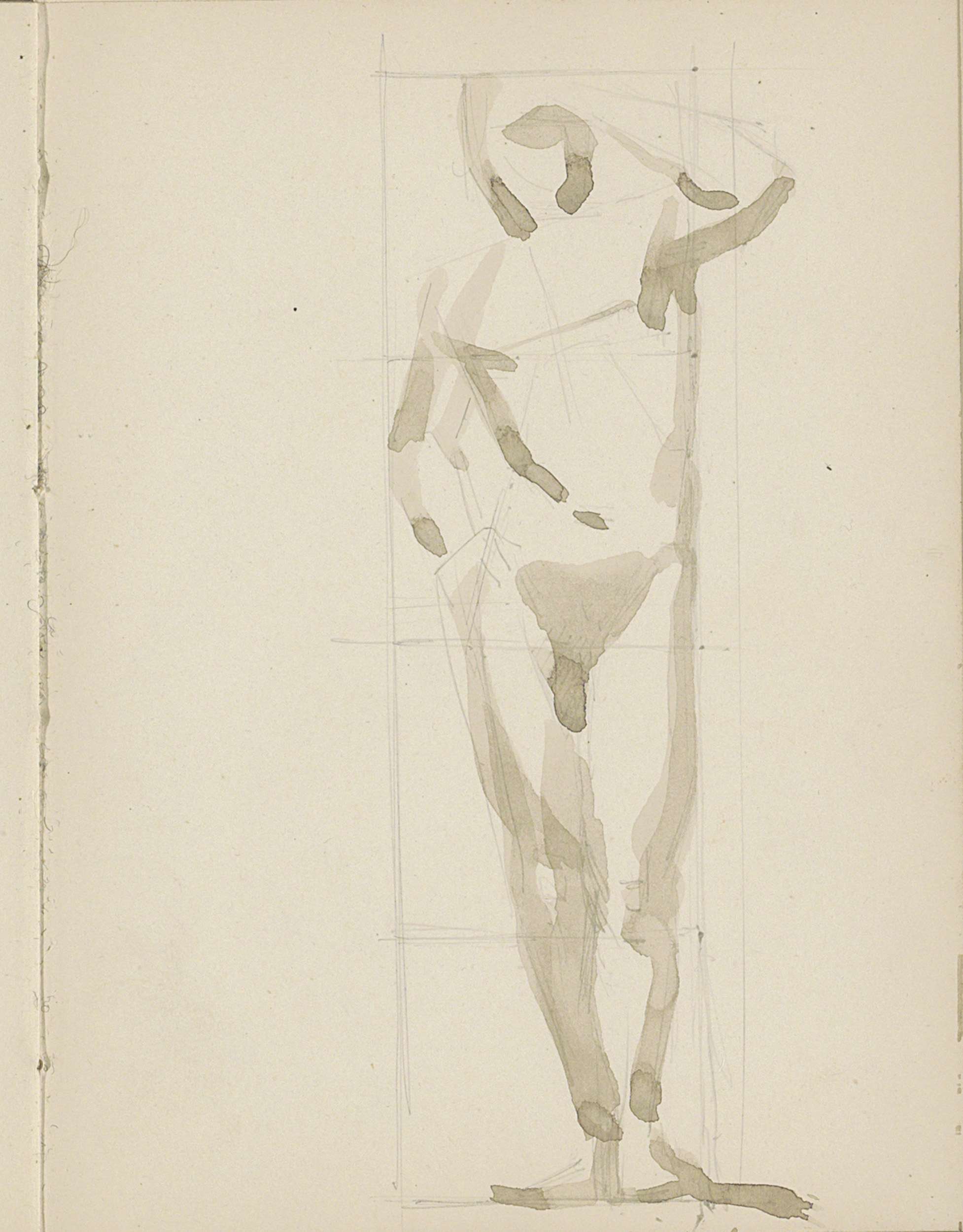 Staande naakte vrouw met één opgeheven arm