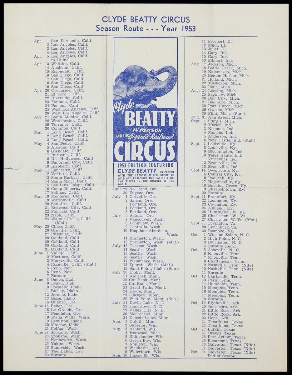 Overzicht tournee Circus Clyde Beatty 1953