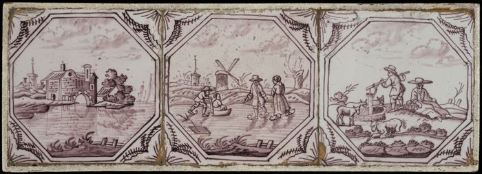 Tegelveld, drie tegels, alle met tafereeldecor in ac...