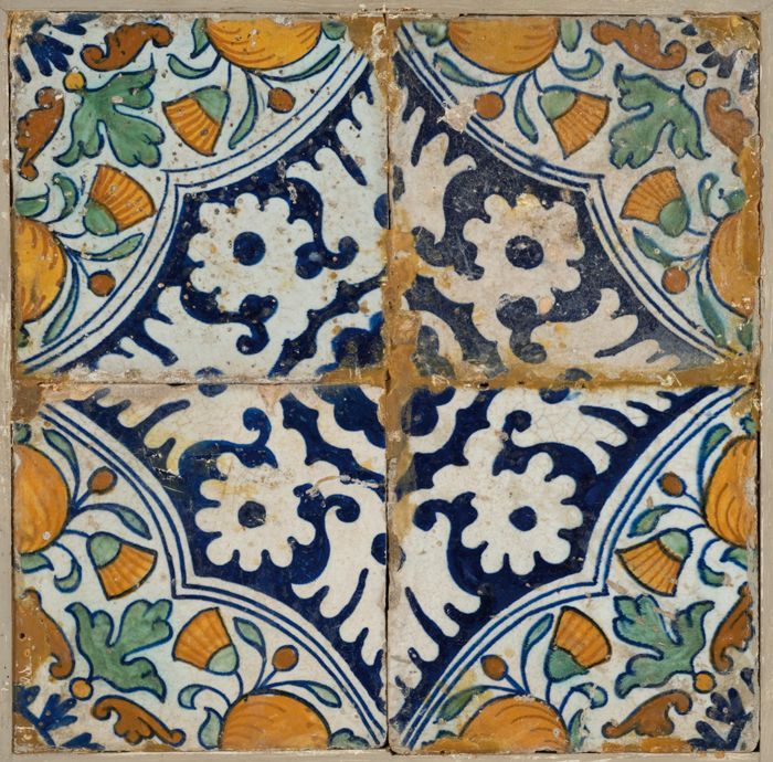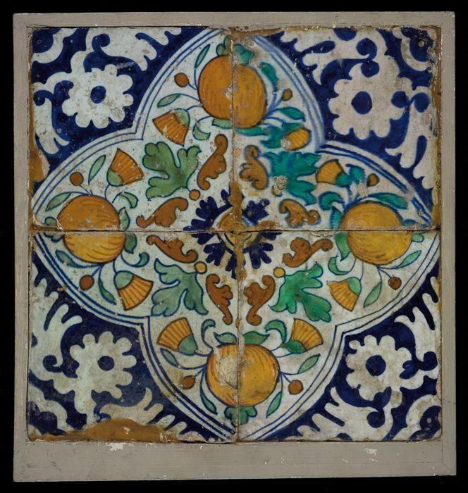 Tegelveld, vier ornamenttegels, oranjeappels in kwar...