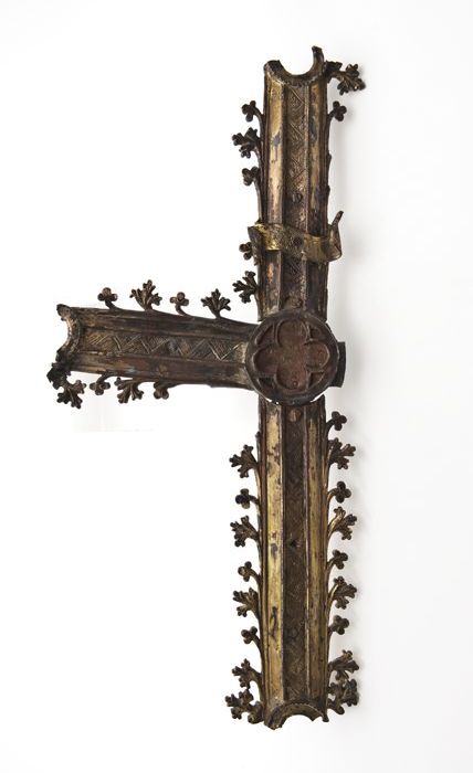 Deel van koperen processiekruis met gegraveerde Chri...