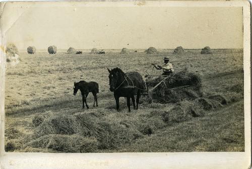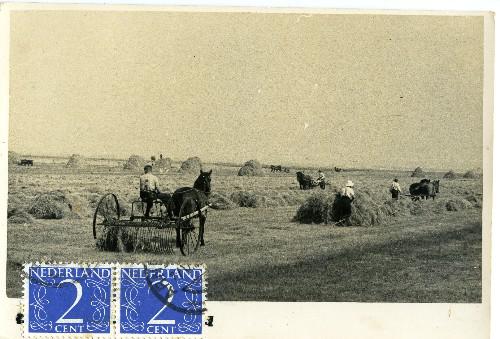 Prentbriefkaart in zwart-wit van hooiland met een ha...