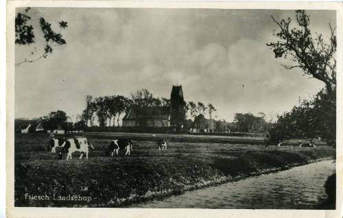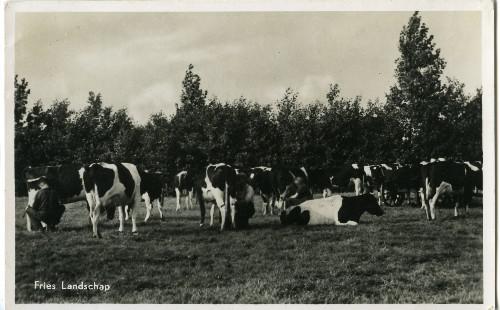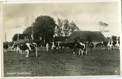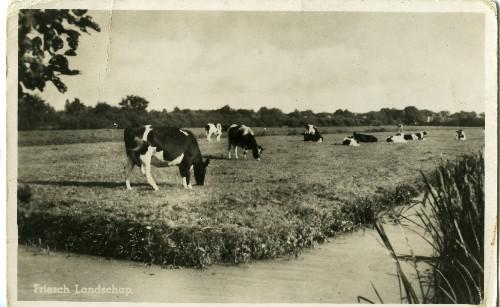 Prentbriefkaart in zwart-wit van een weiland met koe...