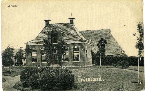 Prentbriefkaart in zwart-wit van een gelede boerderi...