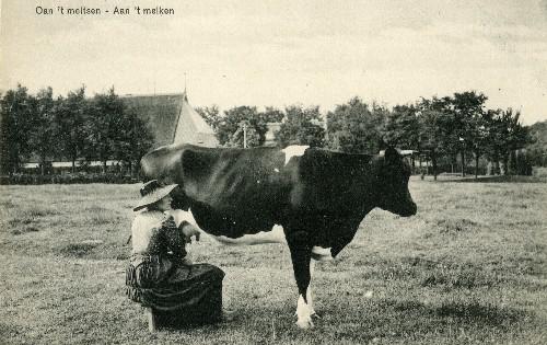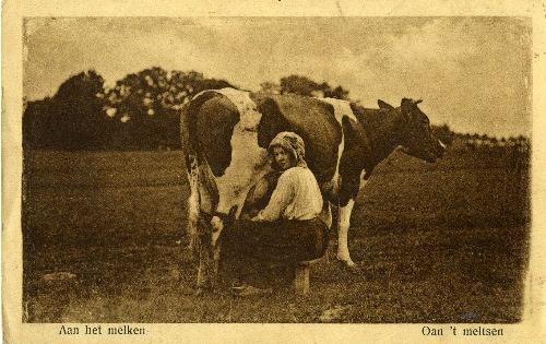 Prentbriefkaart in sepia van een koe in de wei die m...