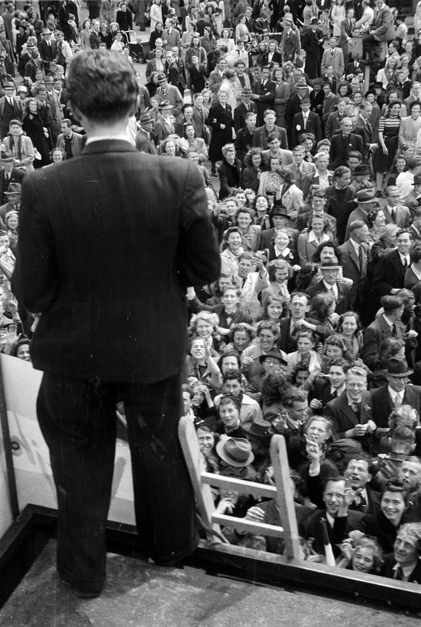 Een menigte heeft zich op een plein in het centrum v...