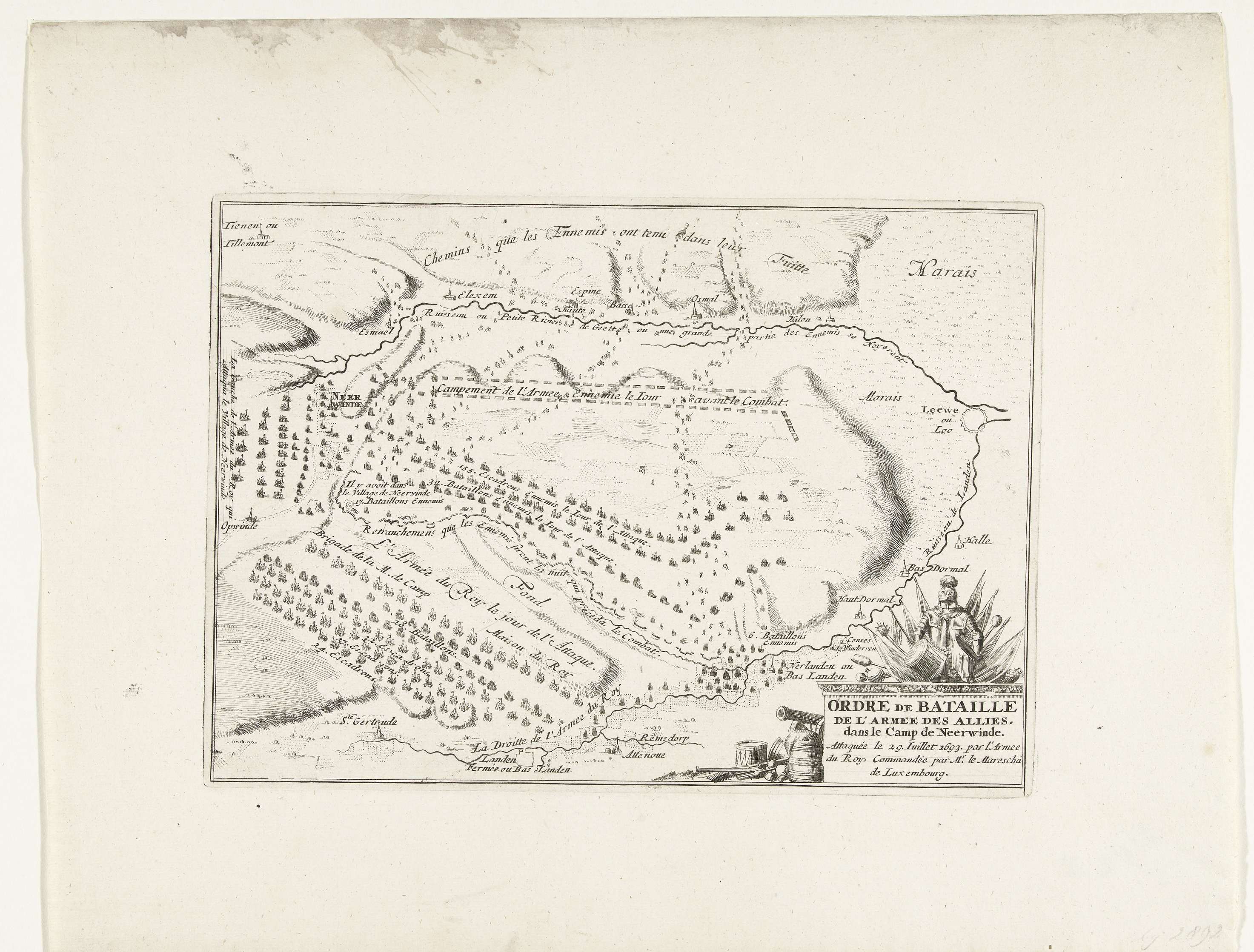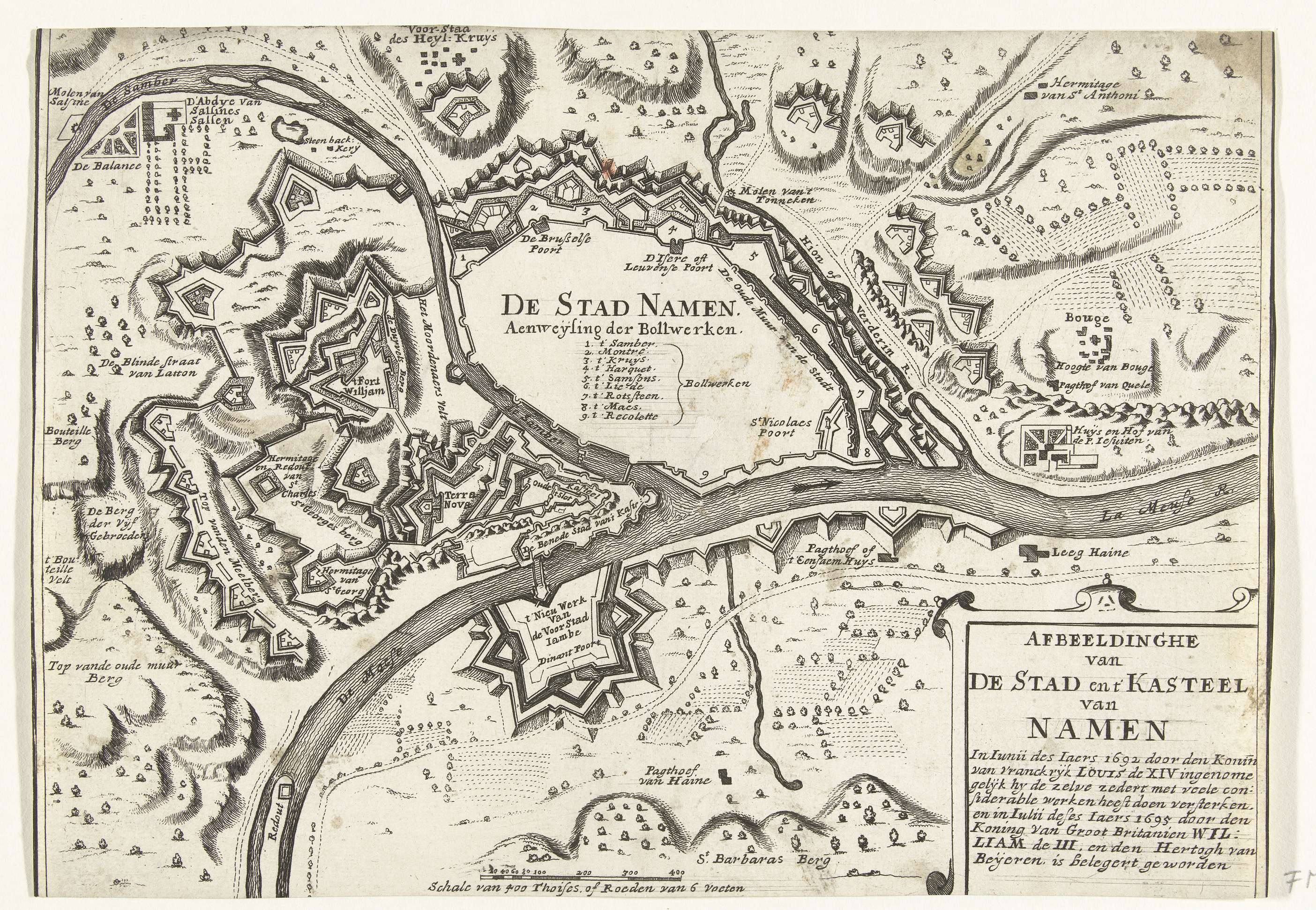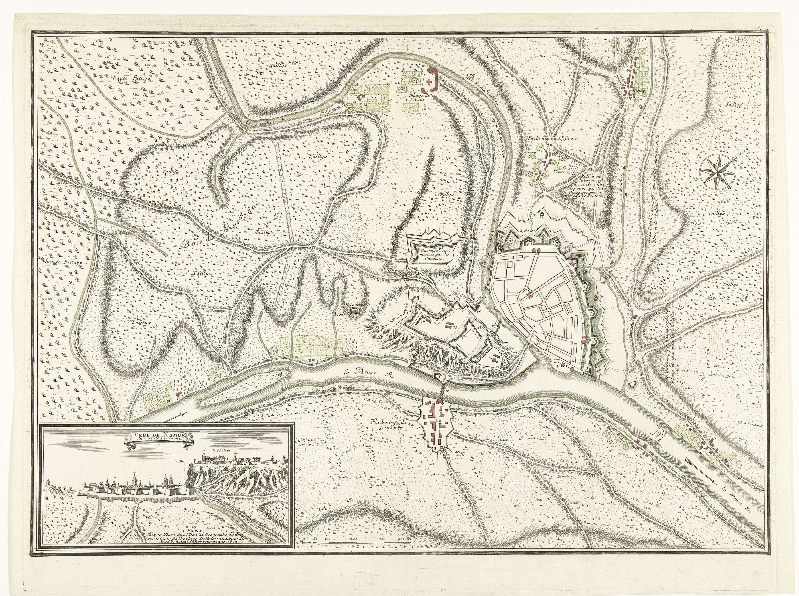 Kaart van de stad Namen met het kasteel, belegerd en...