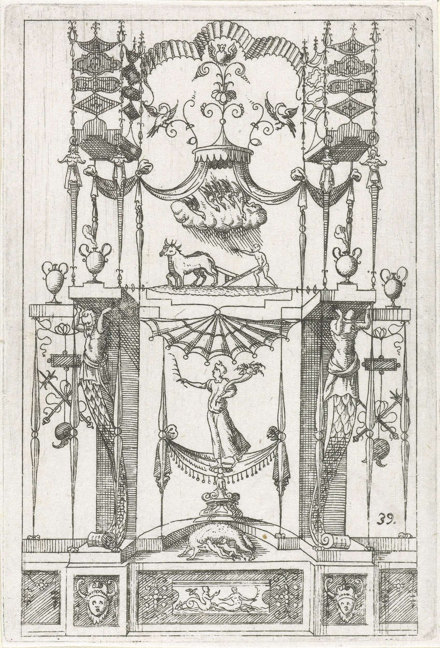 Kandelaber, midden onder knielt een vrouw op een pos...