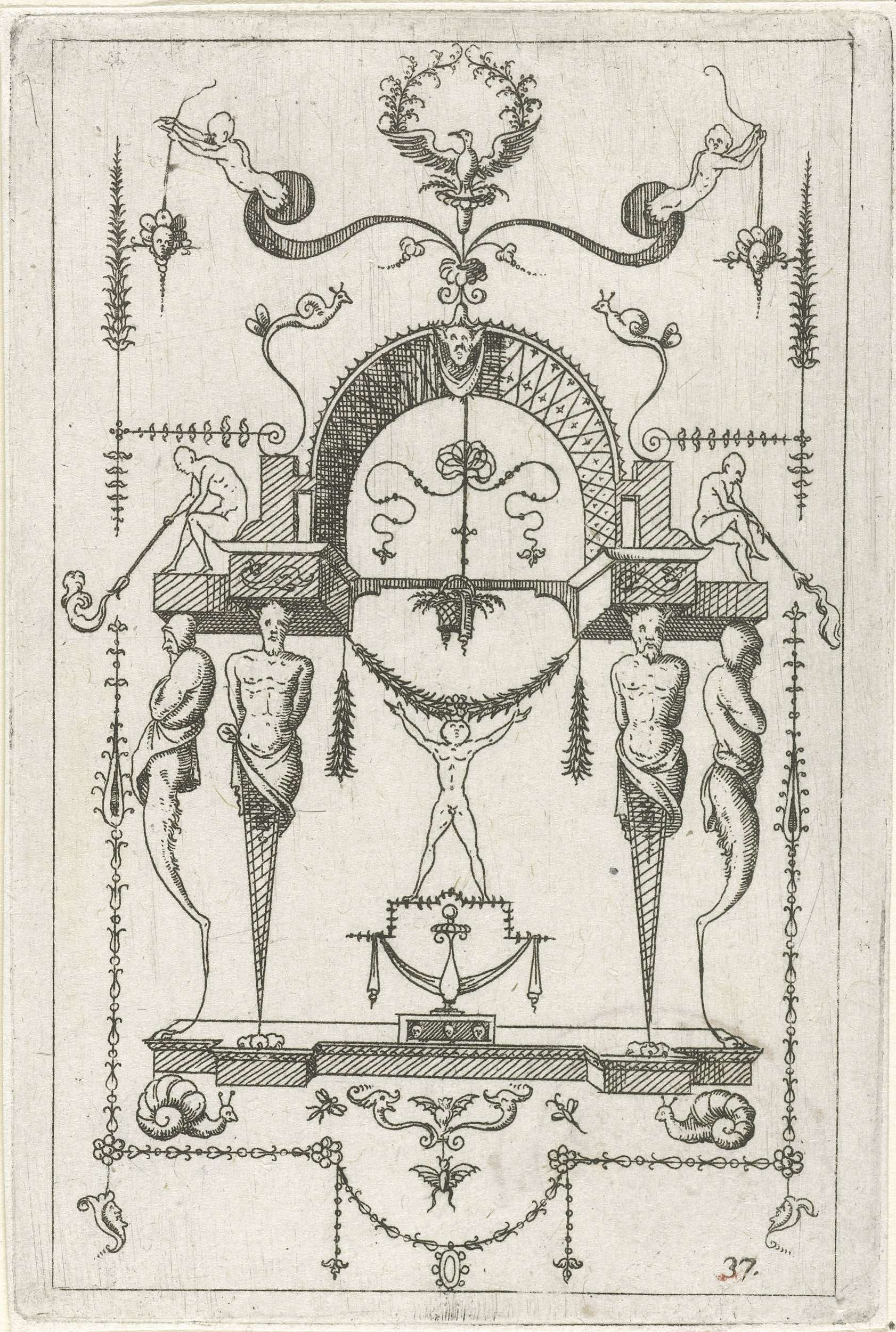 Een met ruiten gedecoreerde boog gedragen door vier ...