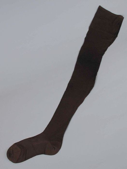Paar lange kousen van fijn donkerbruin tricot kunstz...