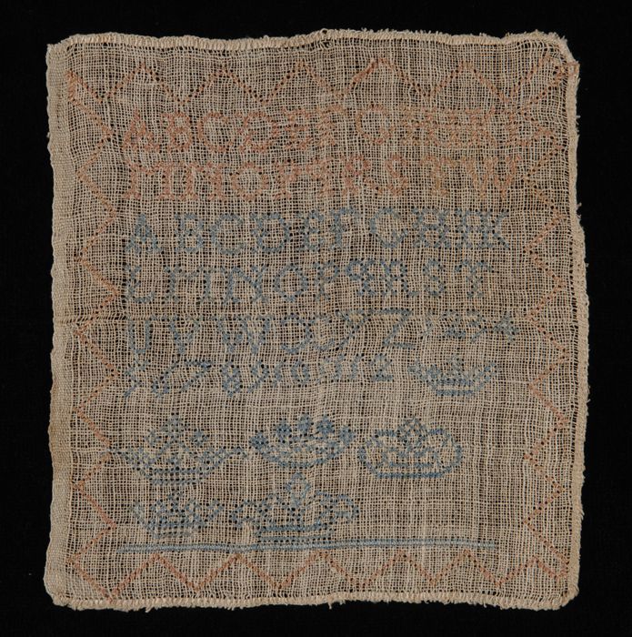 Zeer kleine letterlap gewerkt in kruissteek in blauw...