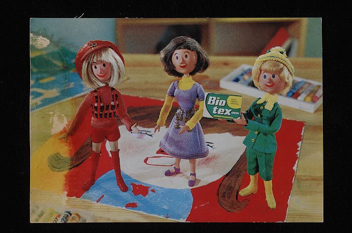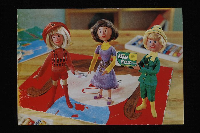 Ansichtkaart van Biotex, met afbeeldingen van reclam...