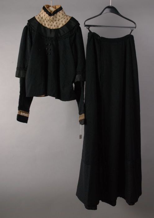 Tweedelige japon van zwarte wol met ingeweven grijze...