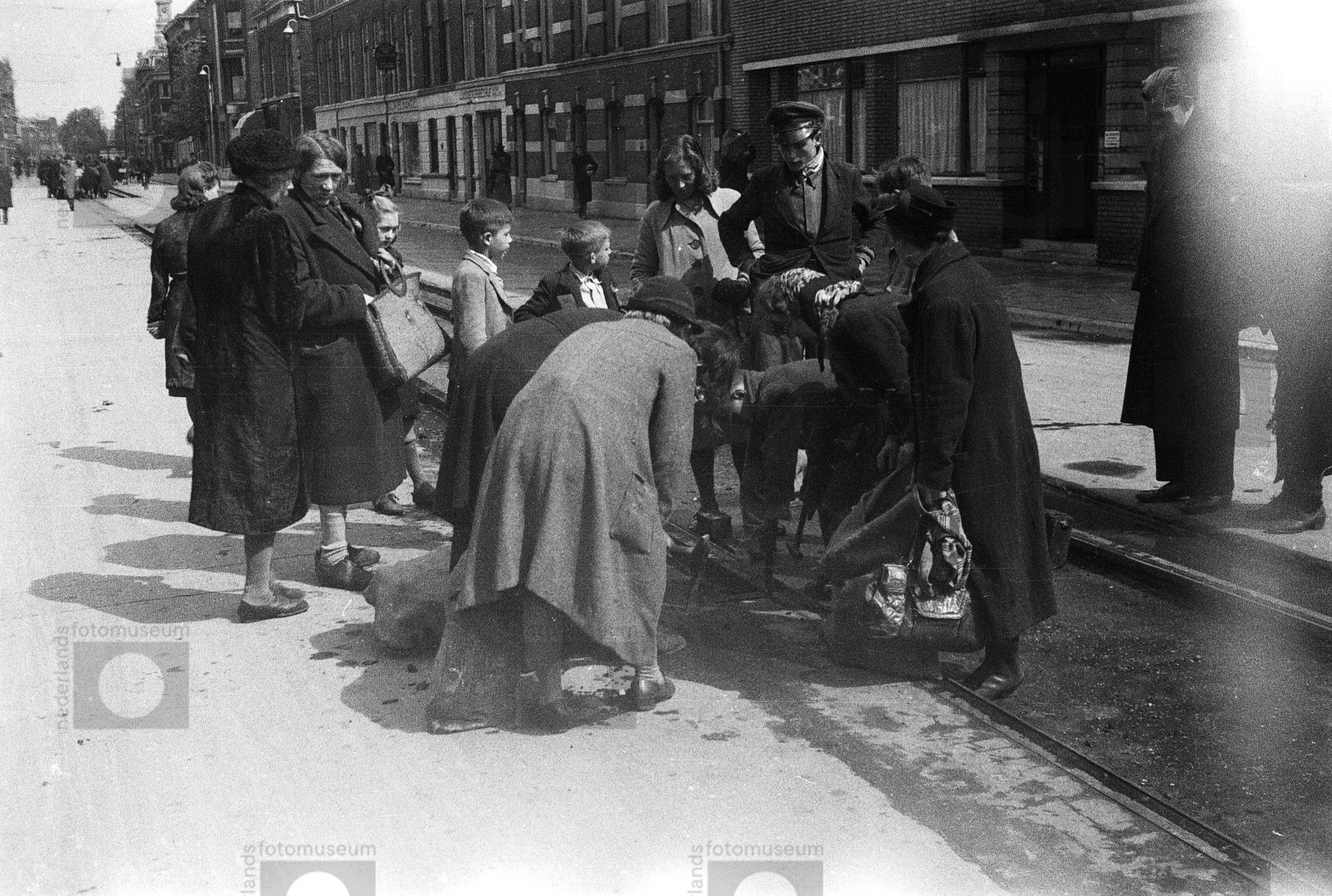 Inwoners verzamelen tussen de tramrails enig brandho...