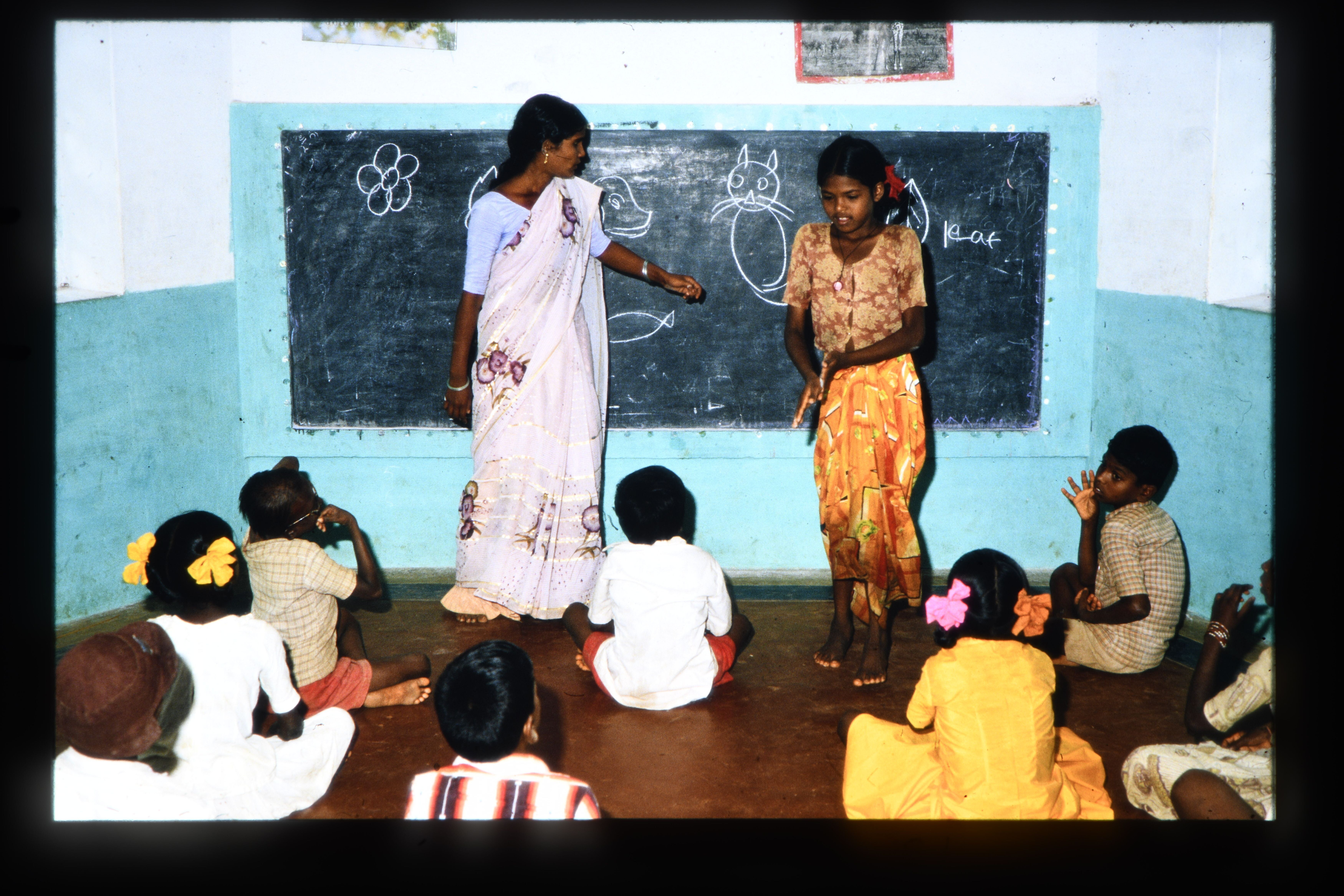 'Kinderen in een dorpje De huizen zijn gemaakt van b...