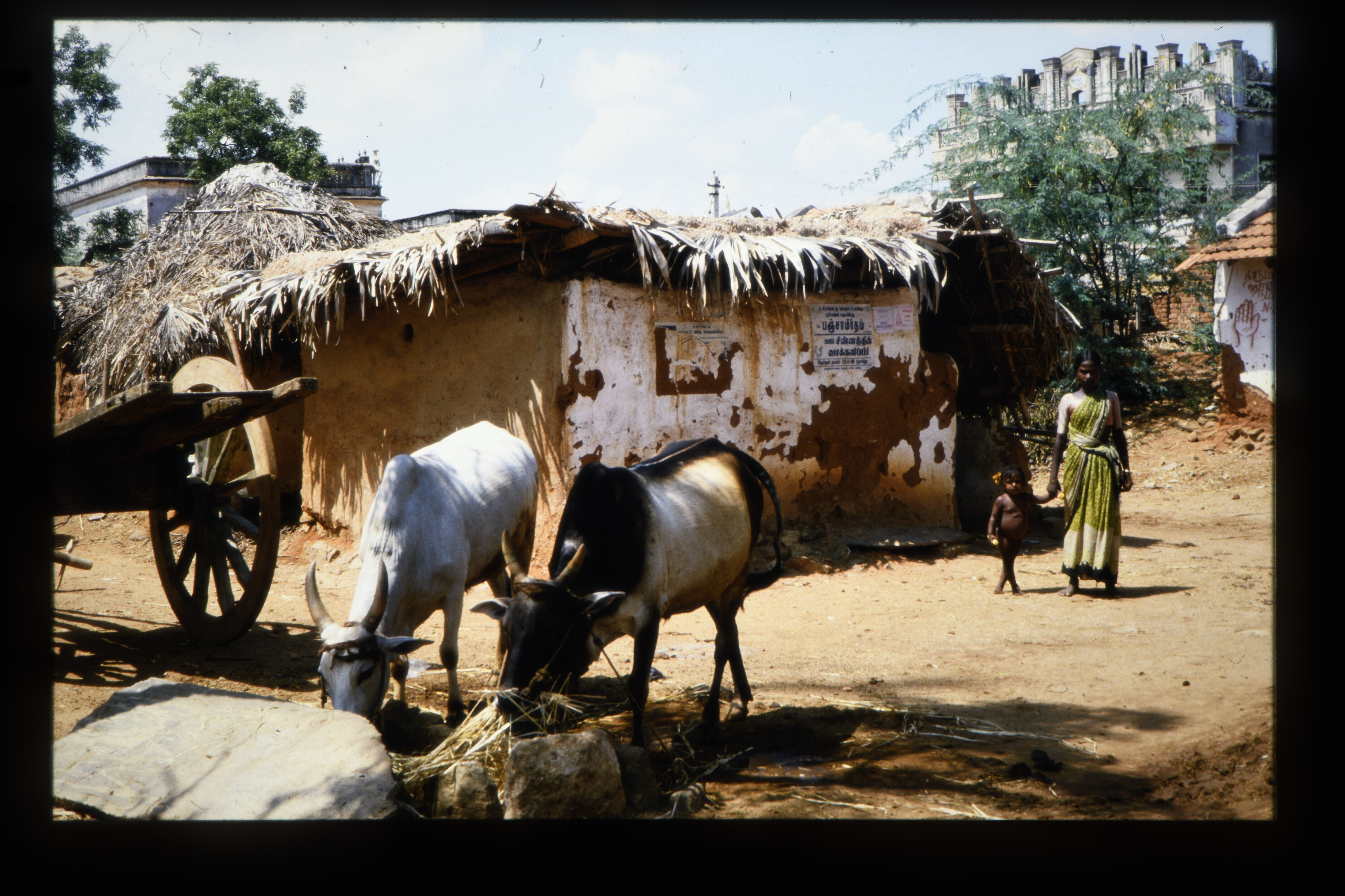 'Vrouwen in een dorpje met kinderen en huisdieren Ei...