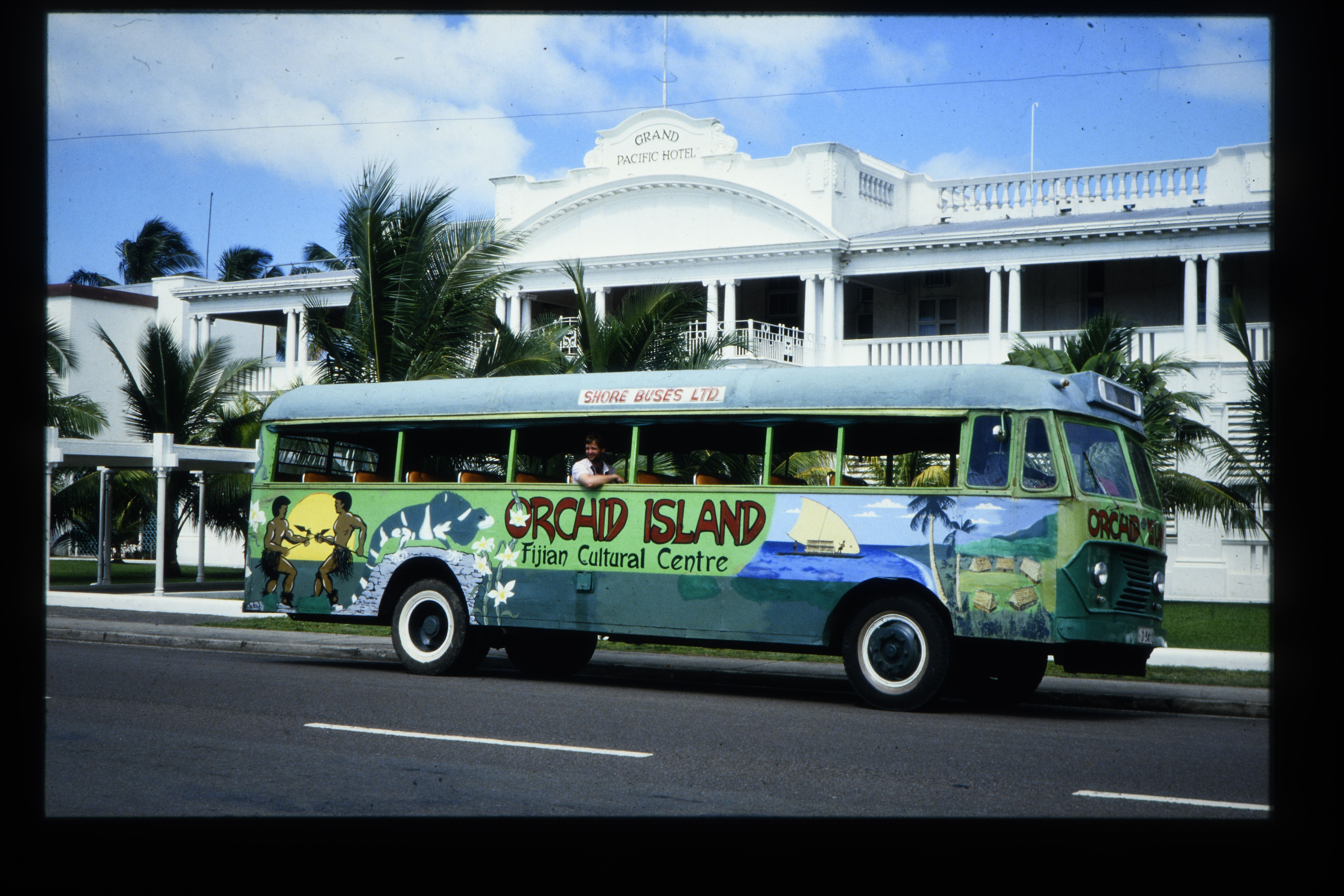 'Het Grand Pacific Hotel met een toeristenbus ervoor...