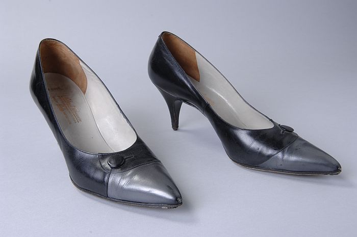 Zwarte leren pumps met zilvergrijze neus en sierknoo...