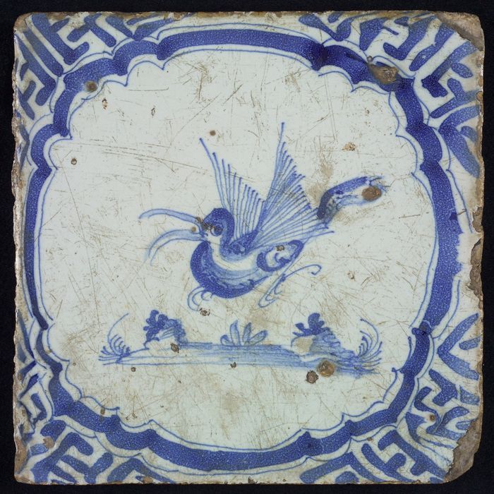 Dierentegel, vogel boven een grondje, hoekmotief Wan-Li