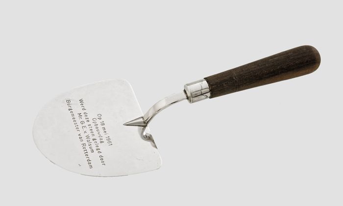 Zilveren troffel met bruin houten handvat, met "Op 1...
