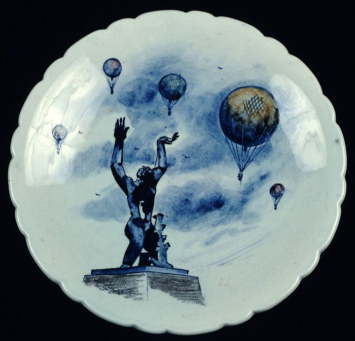 Geglazuurd aardewerken bord, met standbeeld Zadkine ...