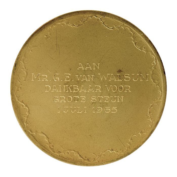Goudkleurige penning met inscriptie en naam burgemee...