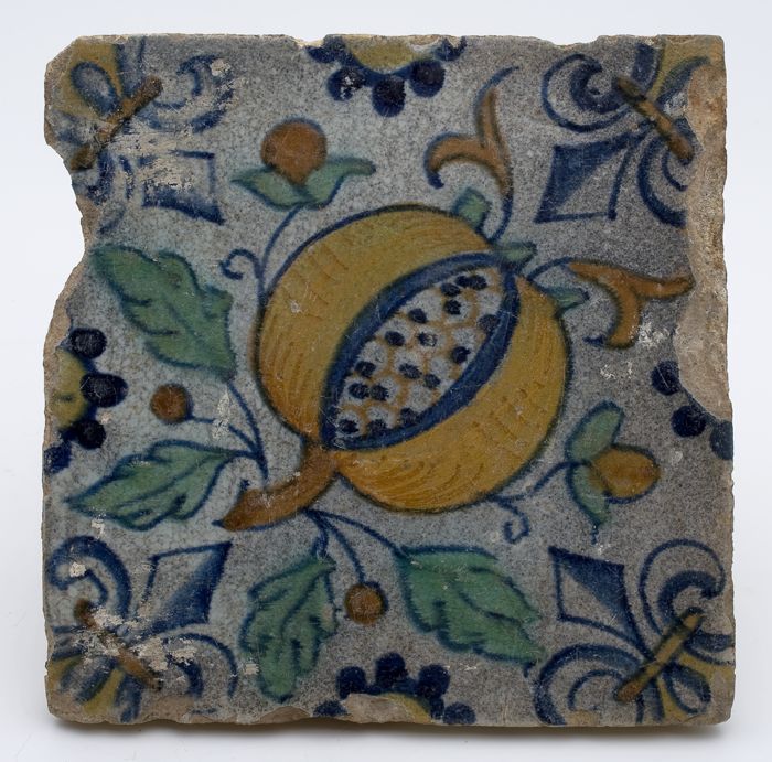 Tegel met polychrome granaatappel, fleur de lis als ...