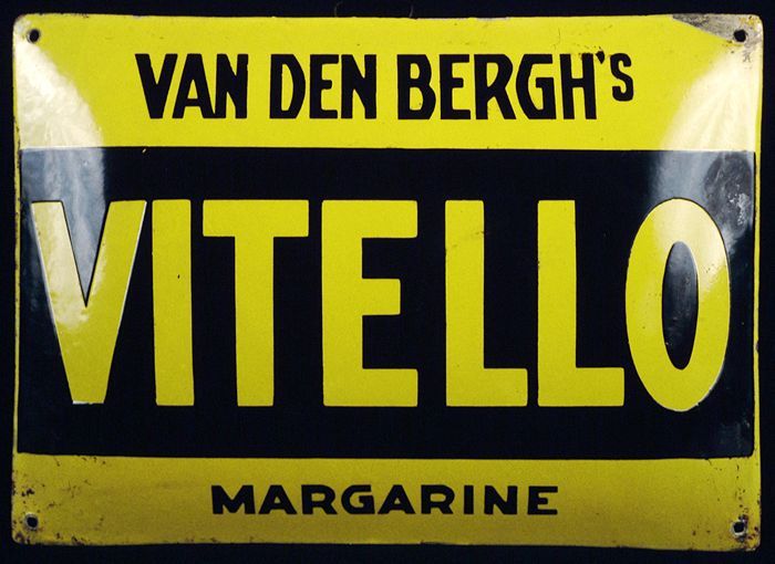 Rechthoekig geel en zwart reclamebord, met "VAN DEN ...