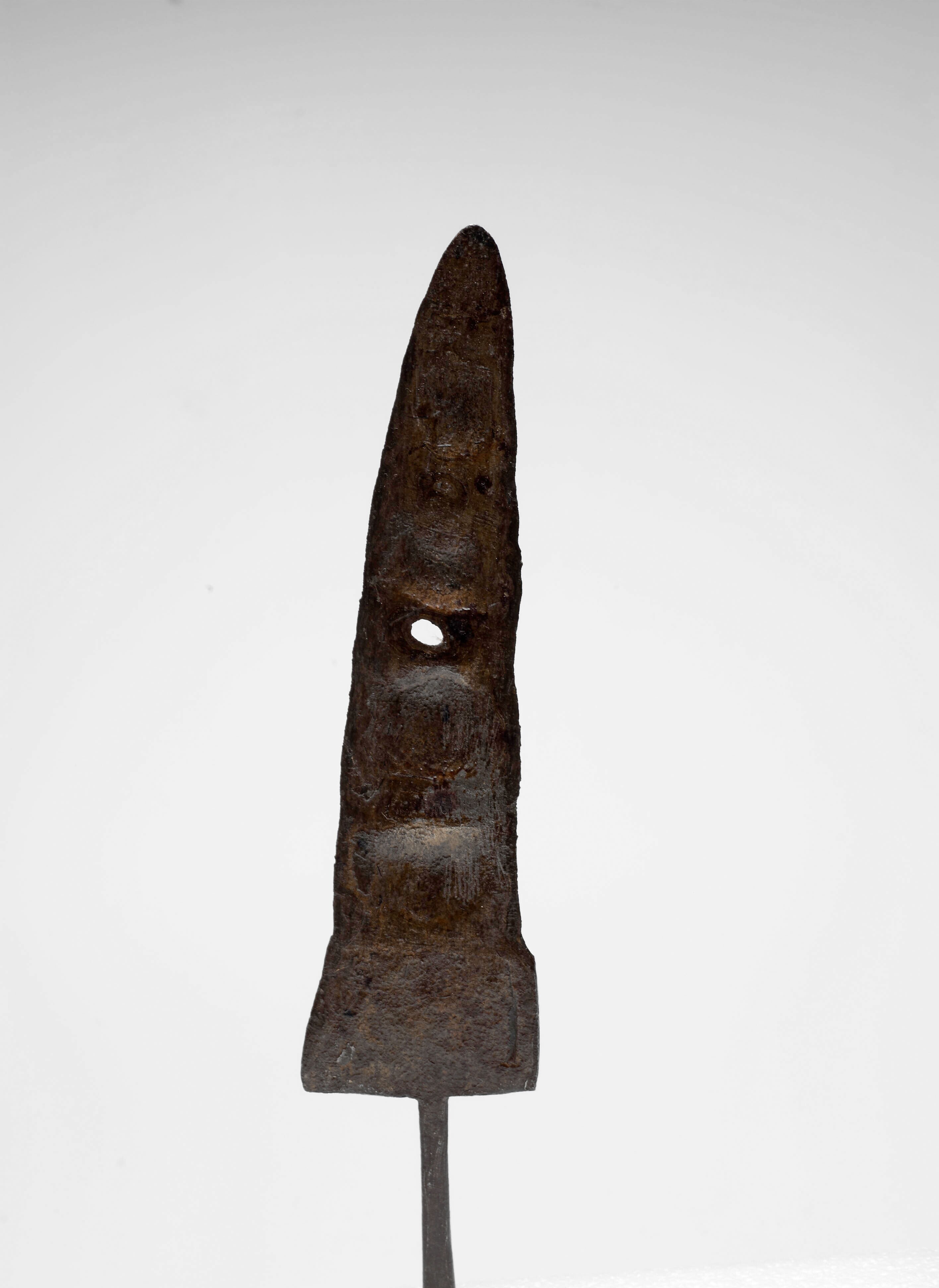 Houten lans voorzien van vlamvormige, overgaand in e...