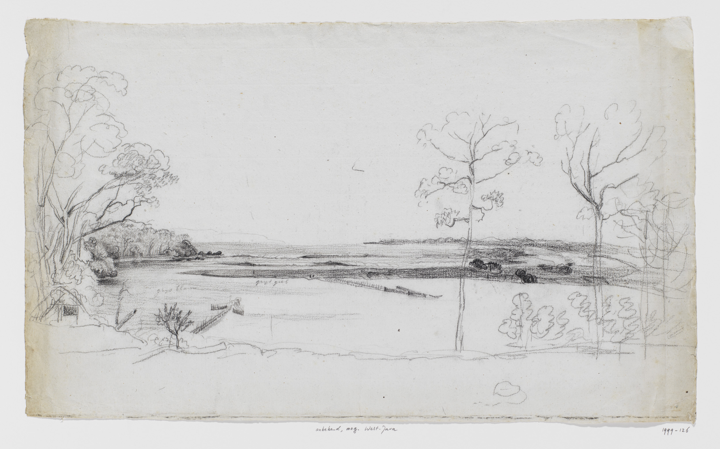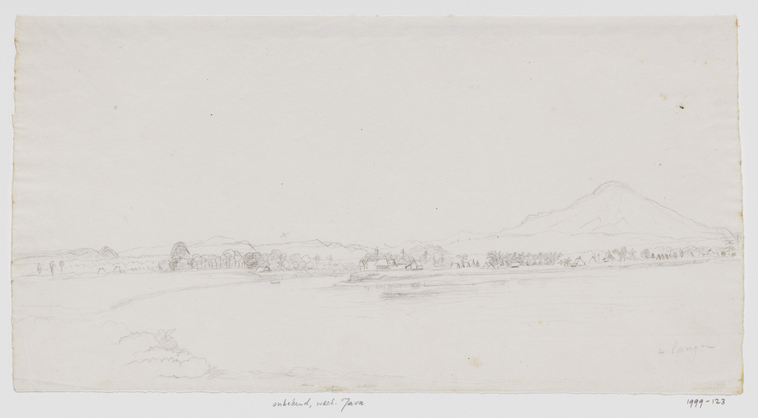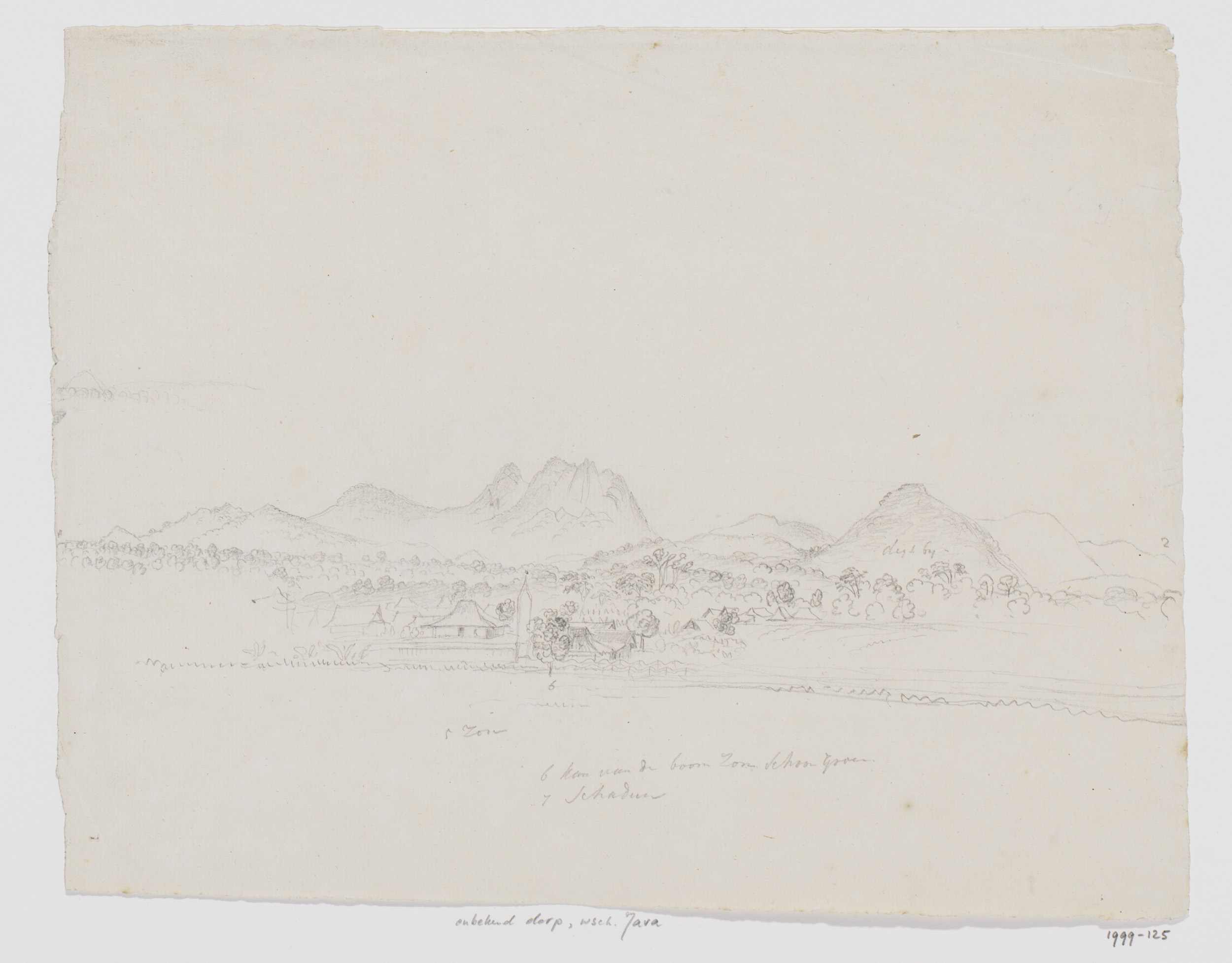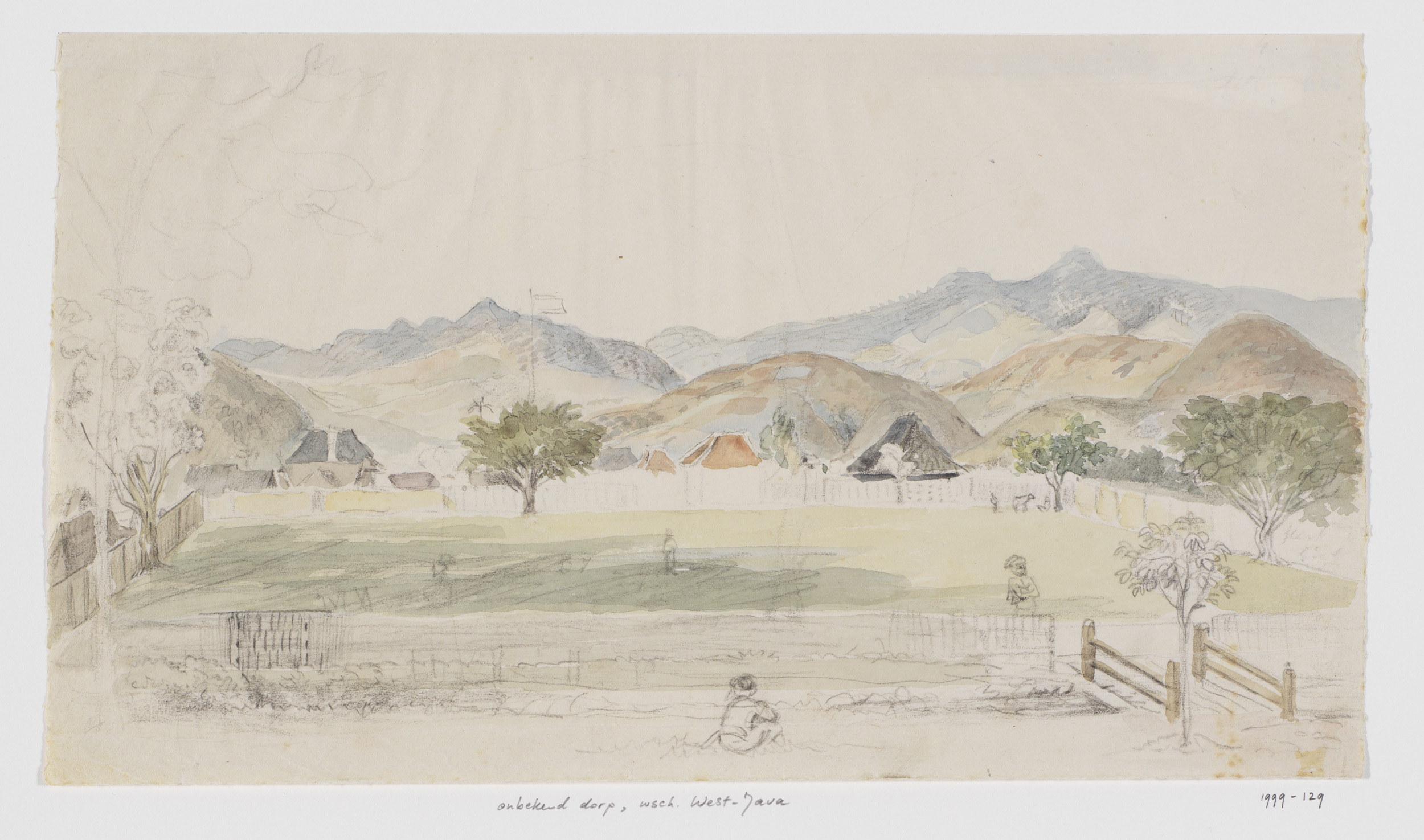 Landschap met dorp, vijver en rijstvelden, West-Java
