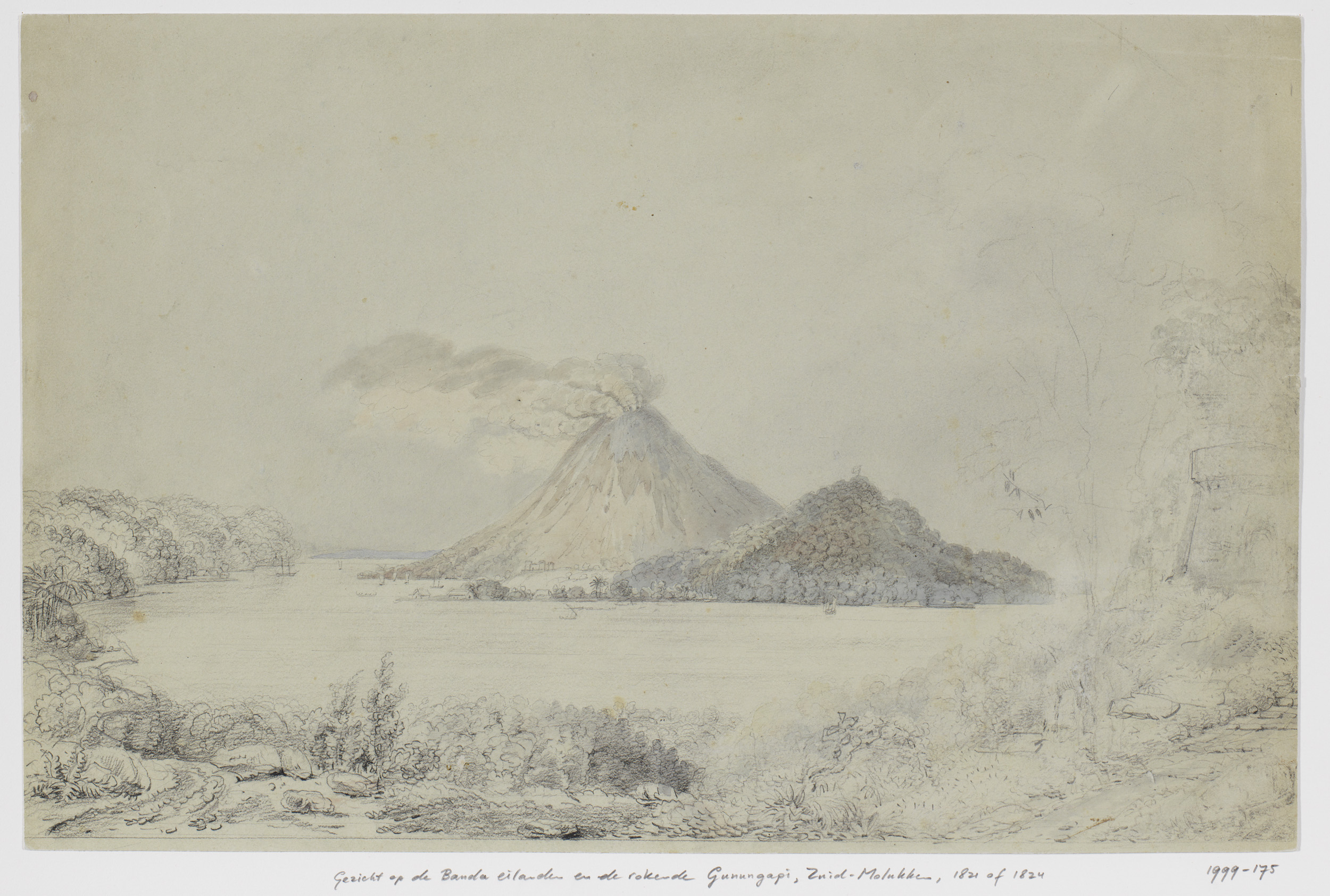 Gezicht op de Banda-eilanden, rechts de rokende vulk...