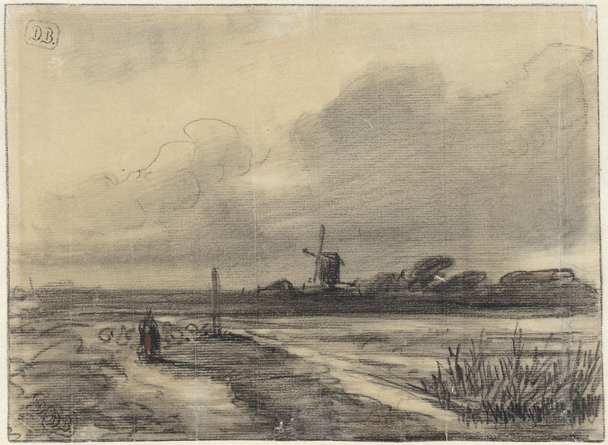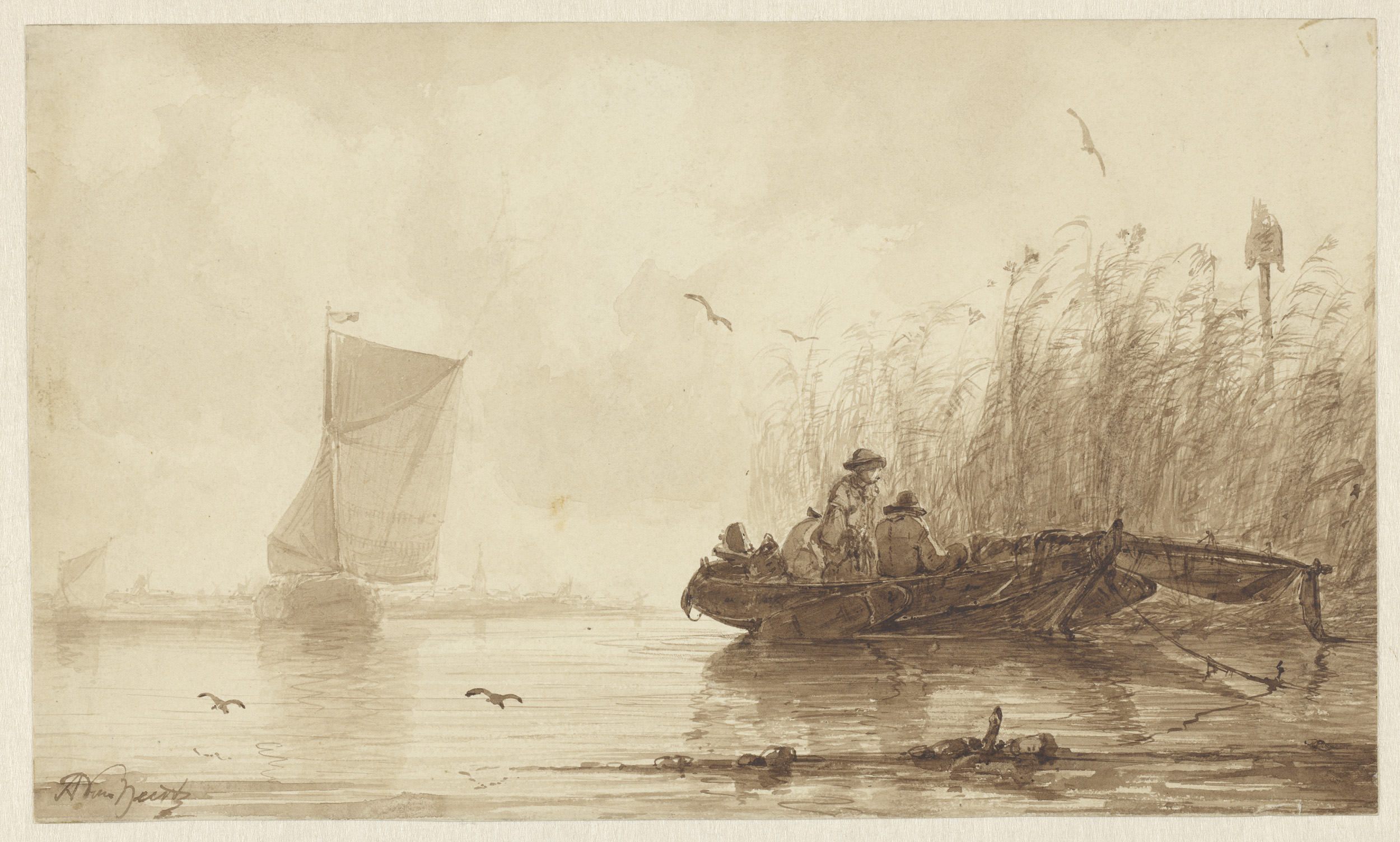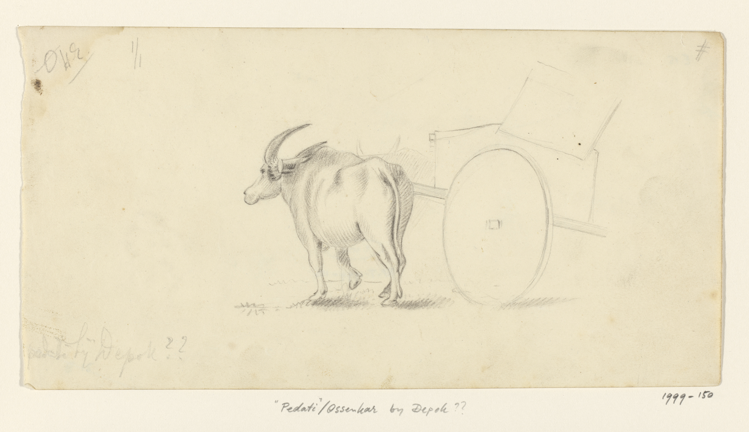 Schetsen van twee mannen, een vaartuig en twee ossen...