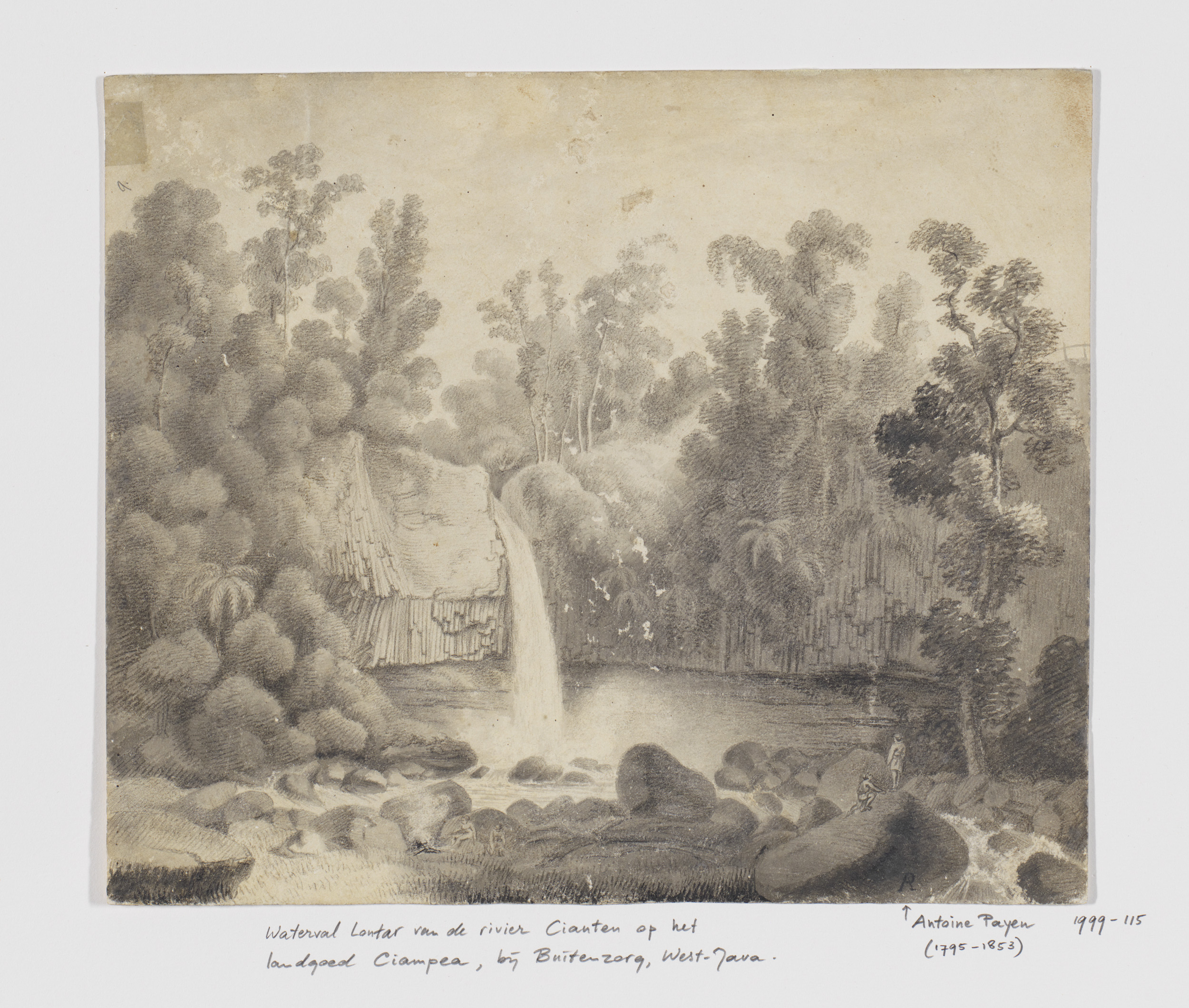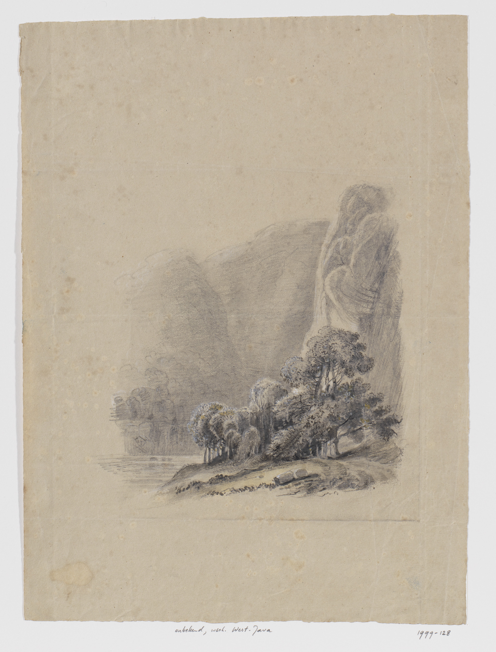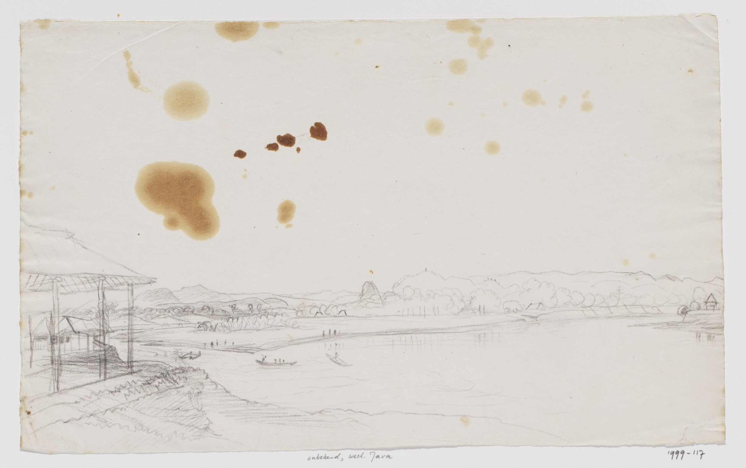 Landschap met rivier en dorp (Leuwibatu), West-Java