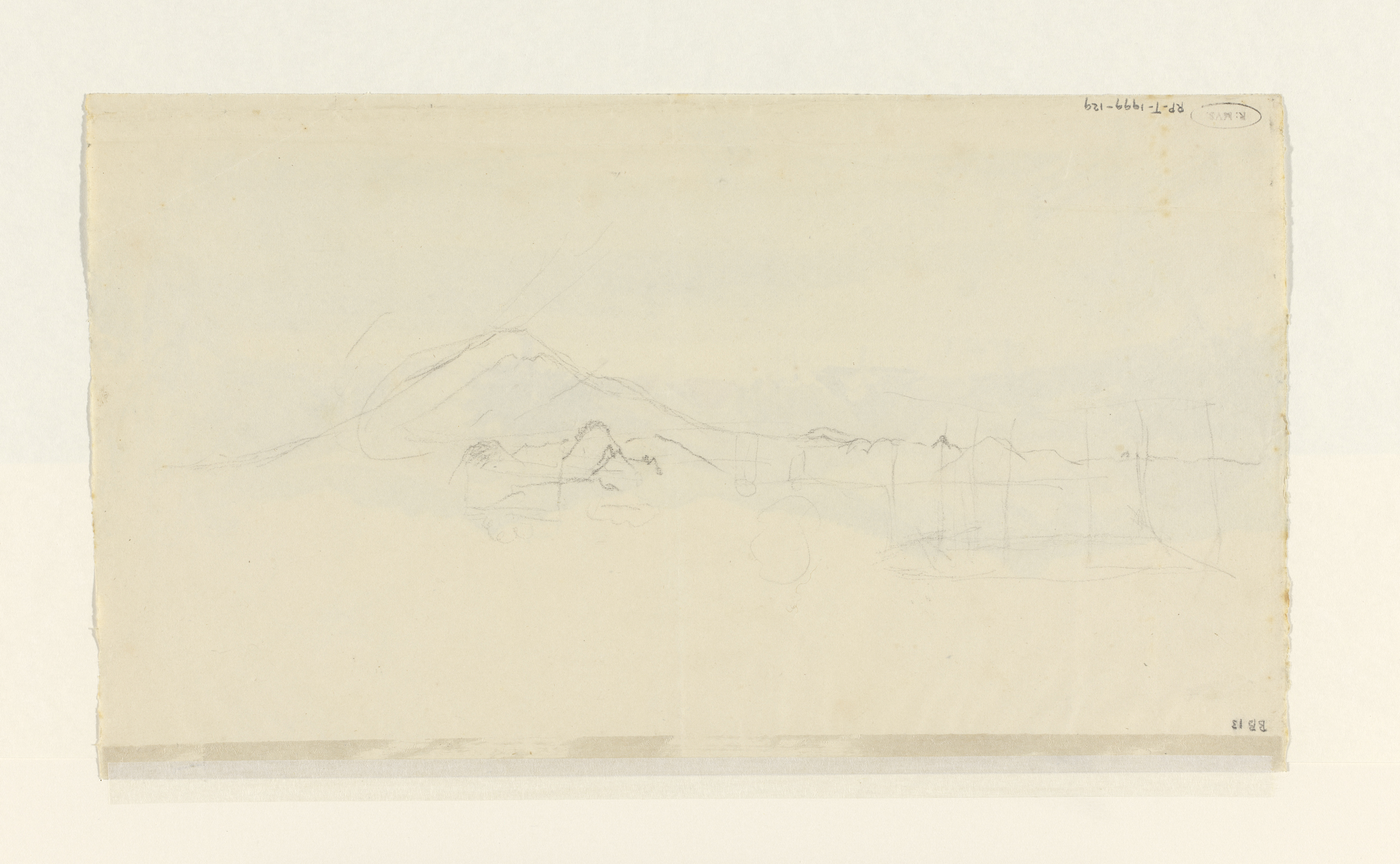 Gezicht op berg en nederzetting, met loodsen voor ko...