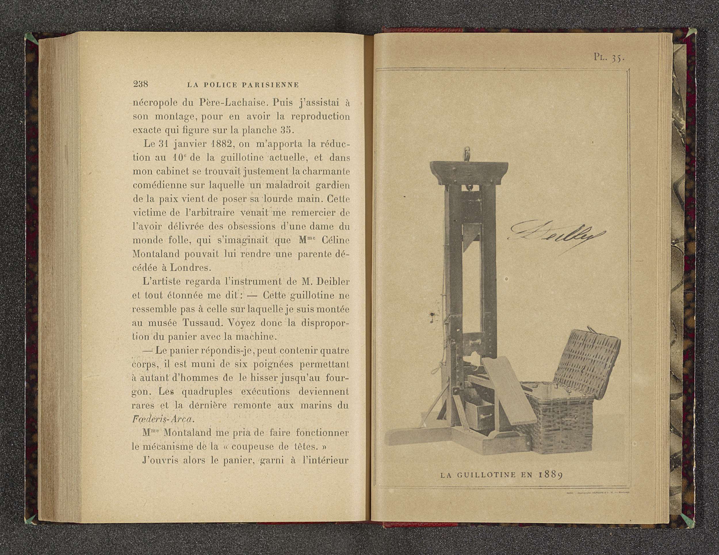 Guillotine met daarachter een mand om het hoofd in o...