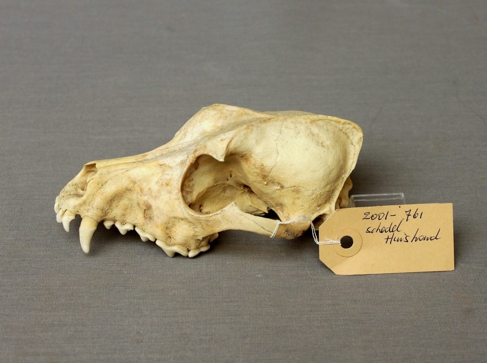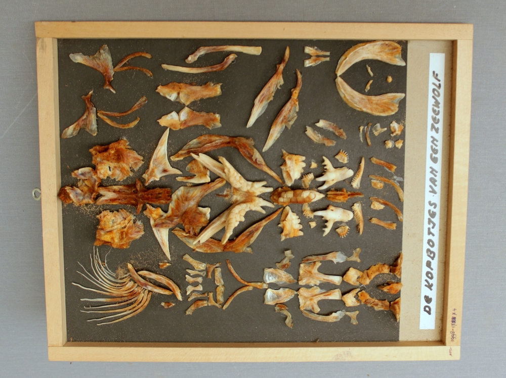 Zeewolf; schedel in onderdelen; op plank gemonteerd