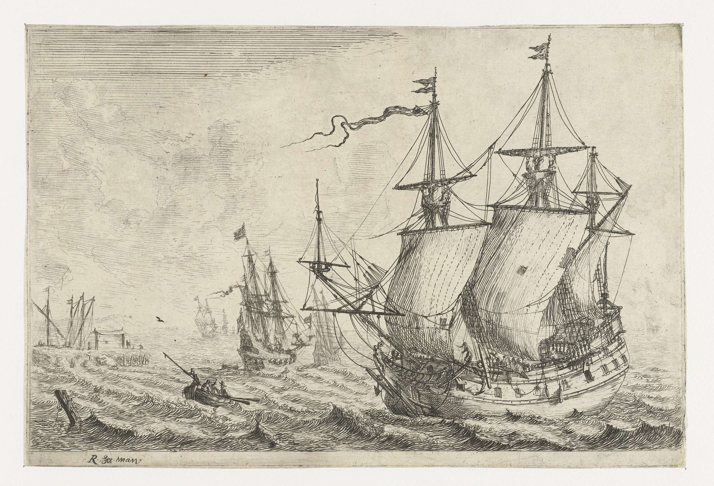 Zeegezicht met verschillende schepen bij een werf