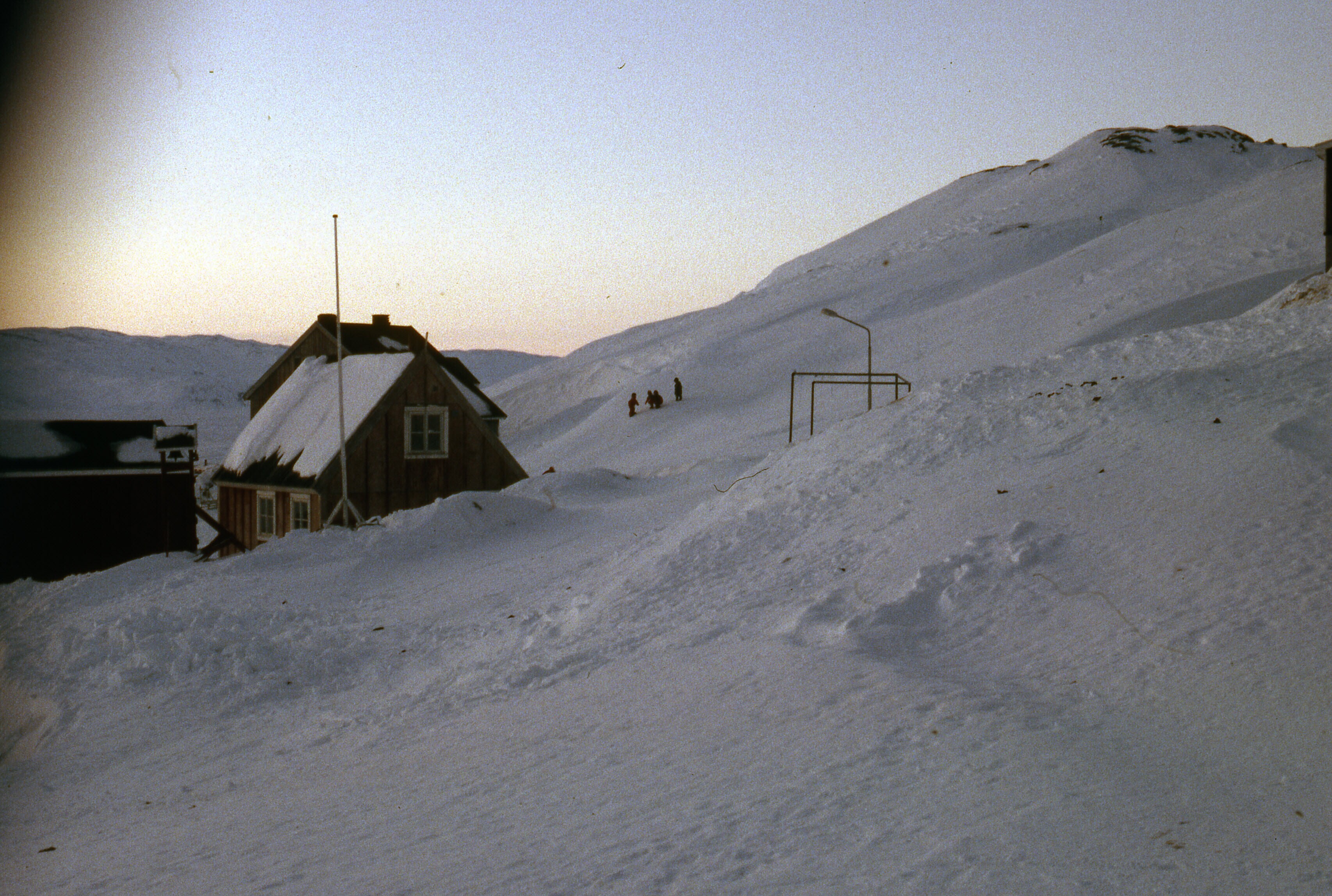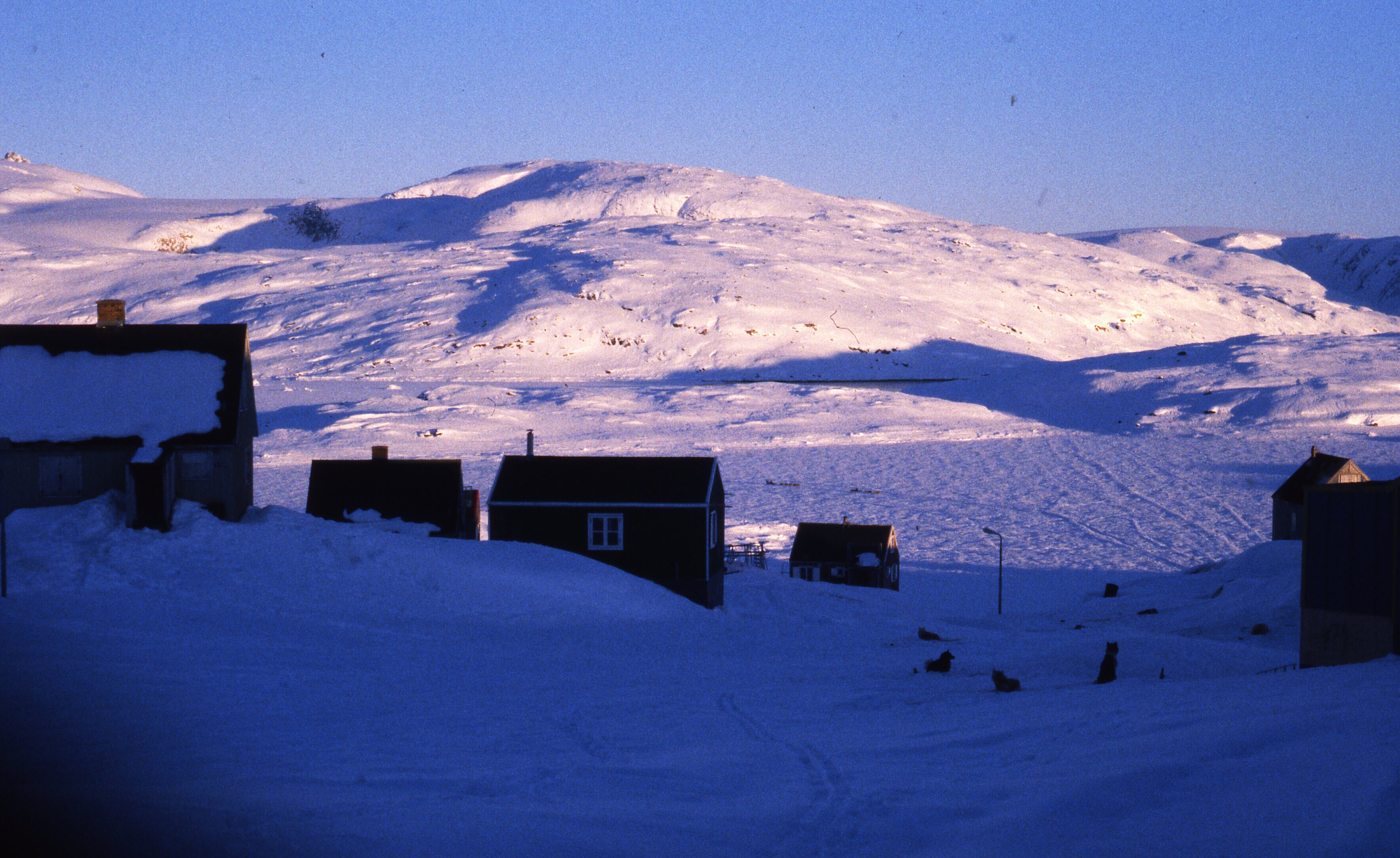 - Besneeuwde huizen op een lichte helling in Tiniteq...