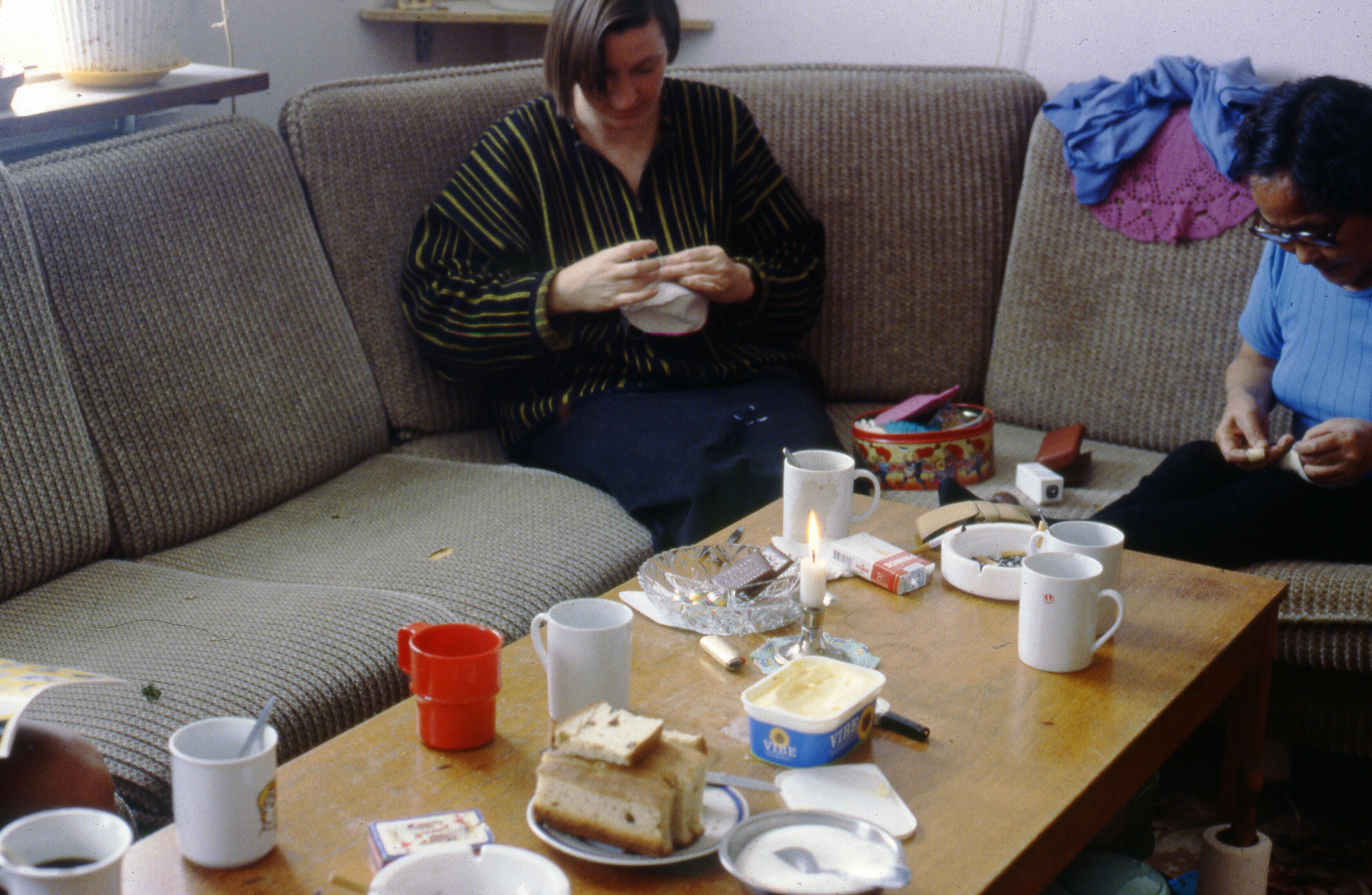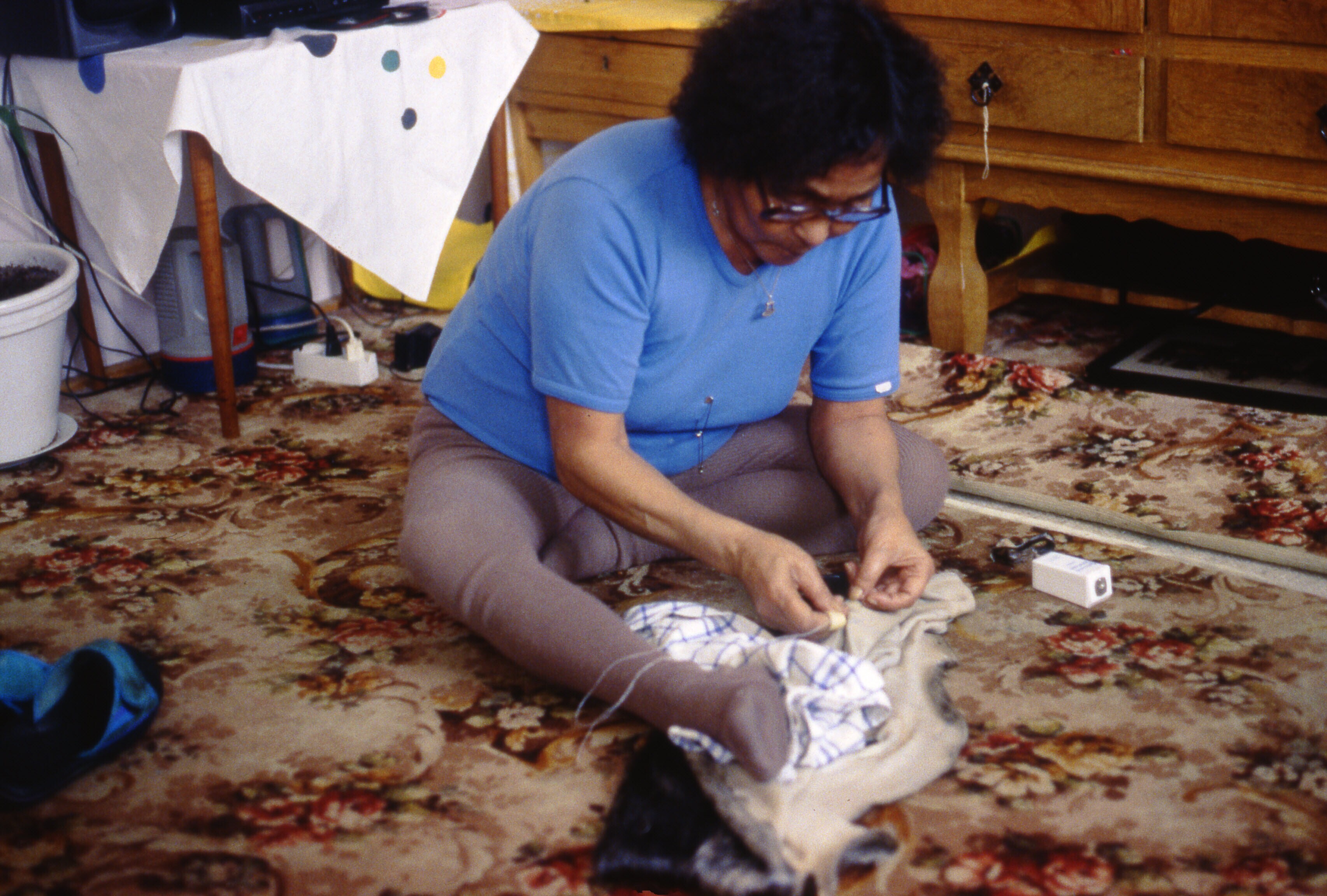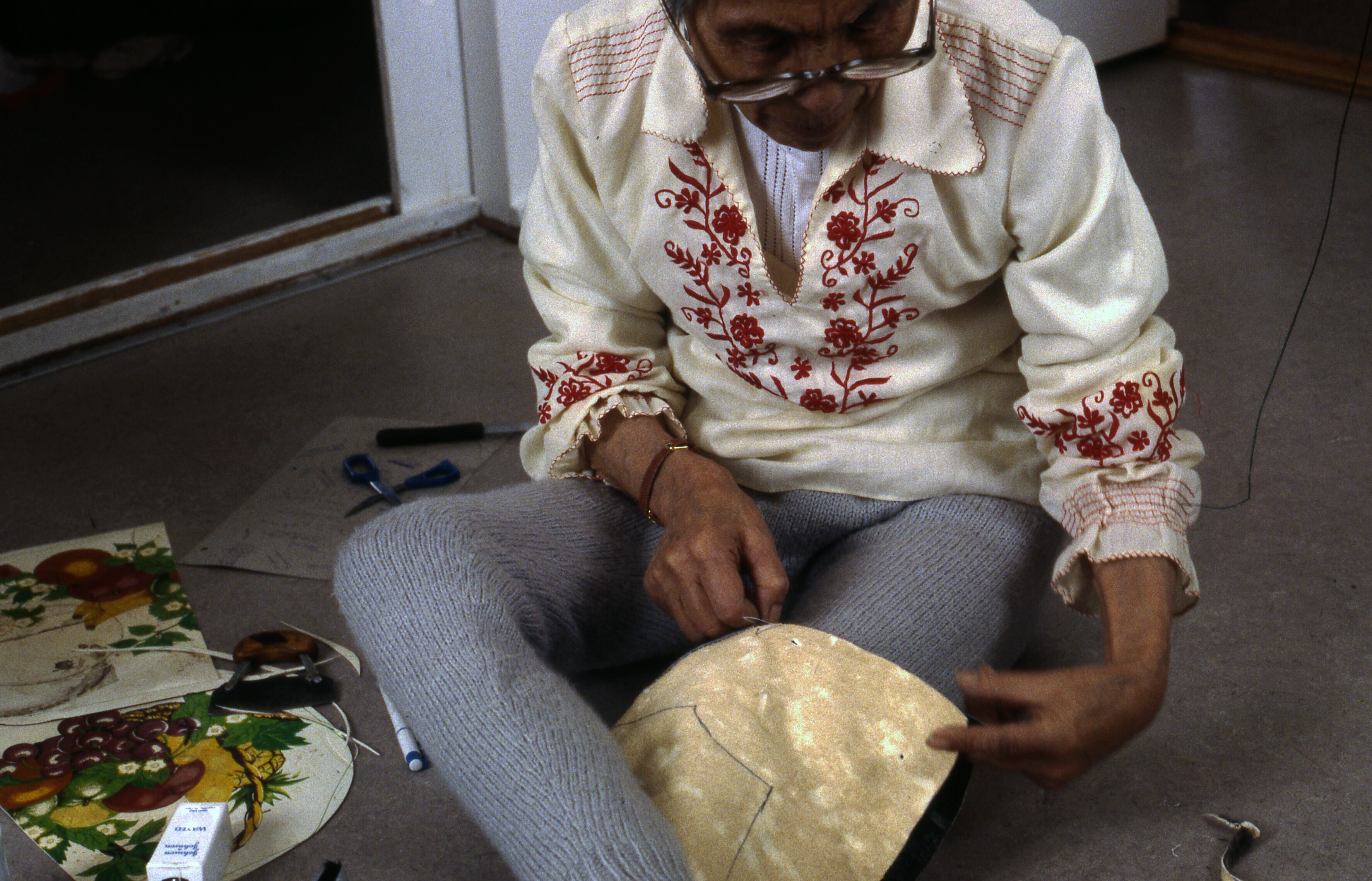 Asta Jonathansen is bezig om wanten te naaien van ge...