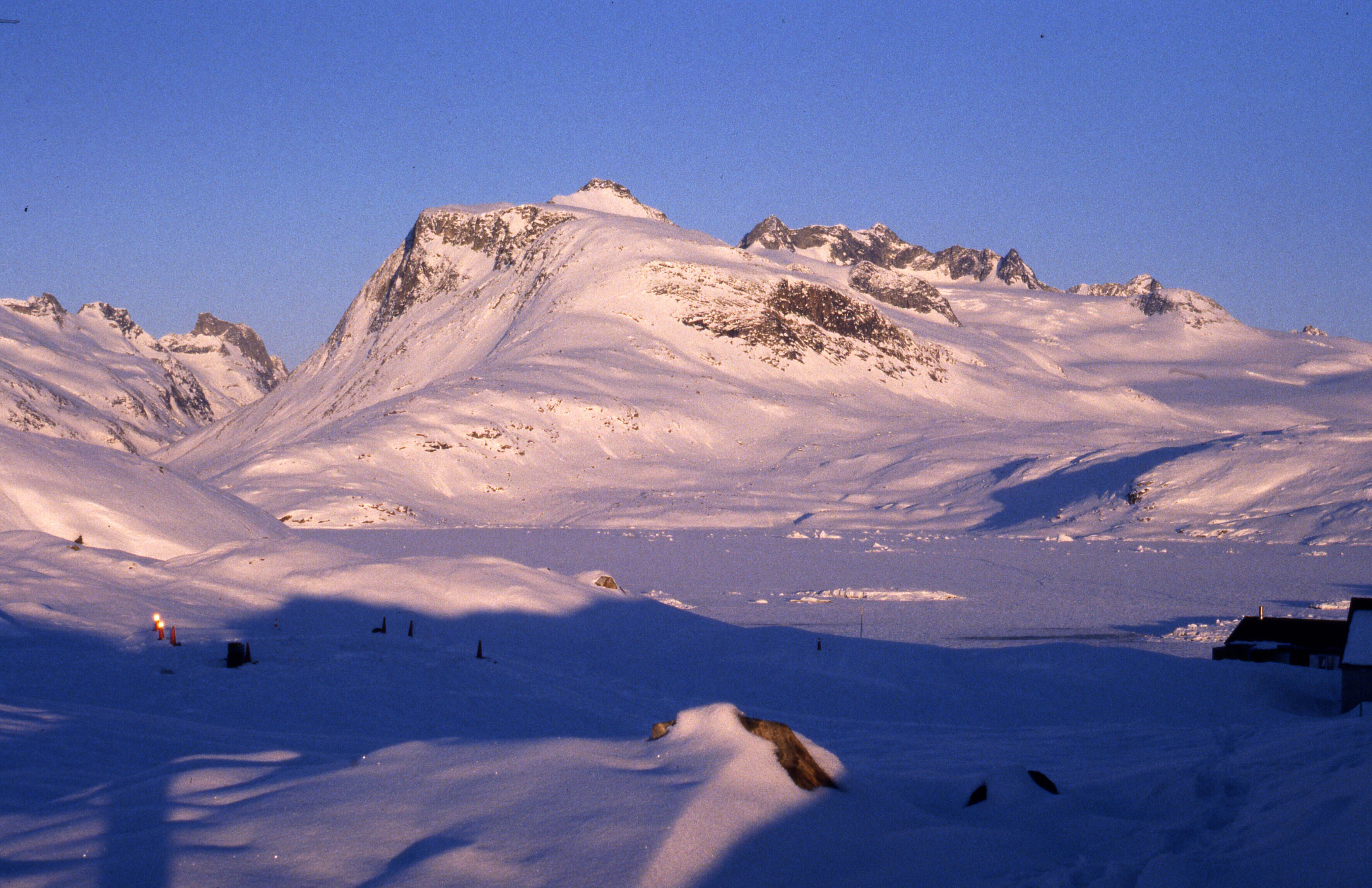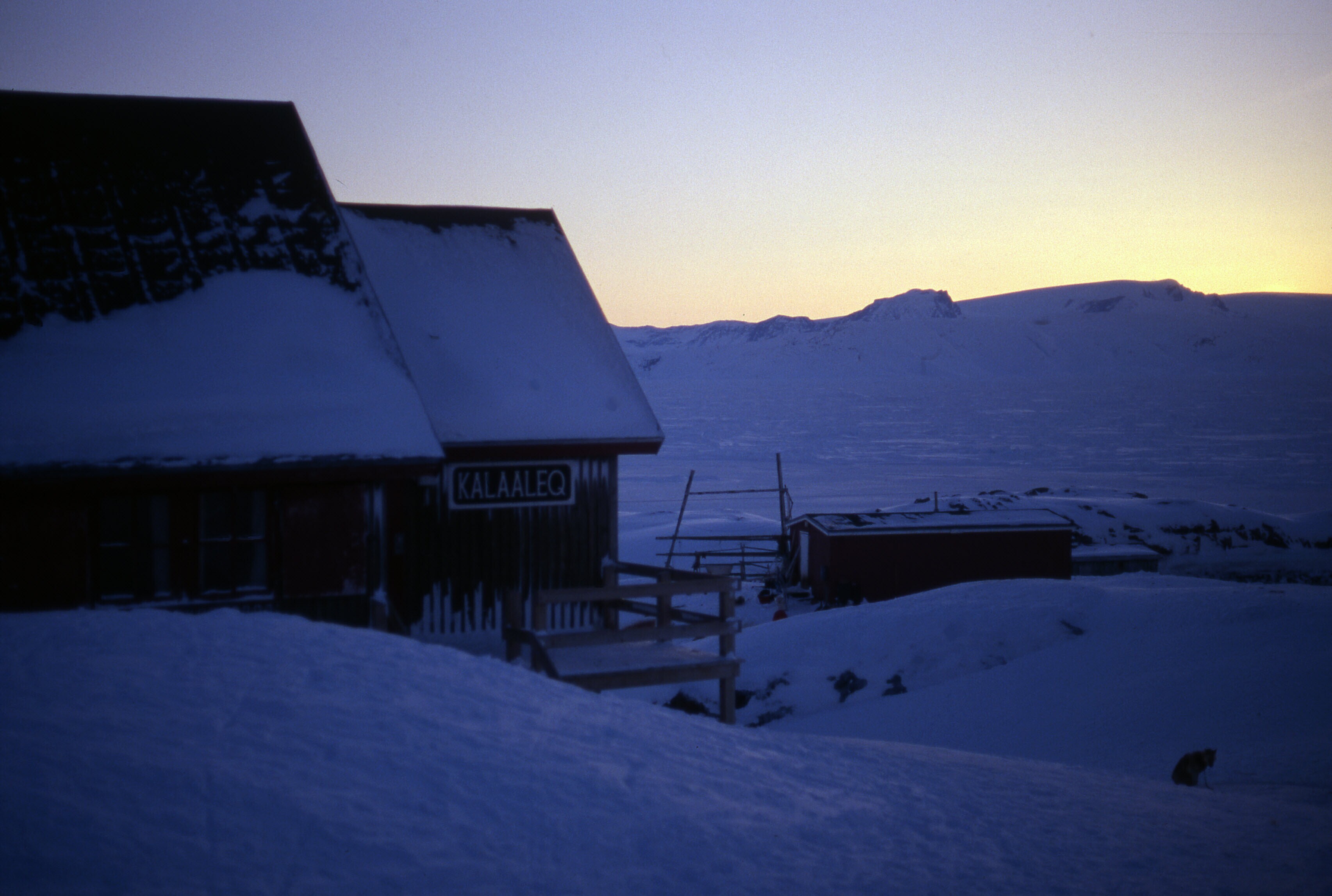 Zicht op Tiniteqilaaq in de sneeuw, bij avondlicht, ...