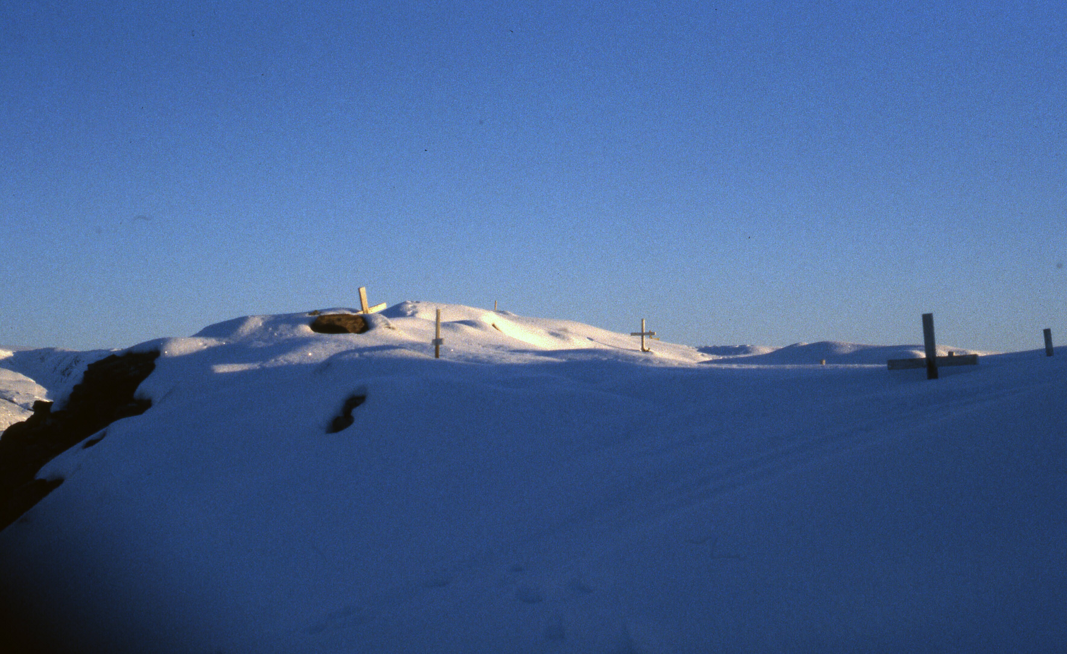 Landschap, besneeuwde berghelling met kruizen op enk...