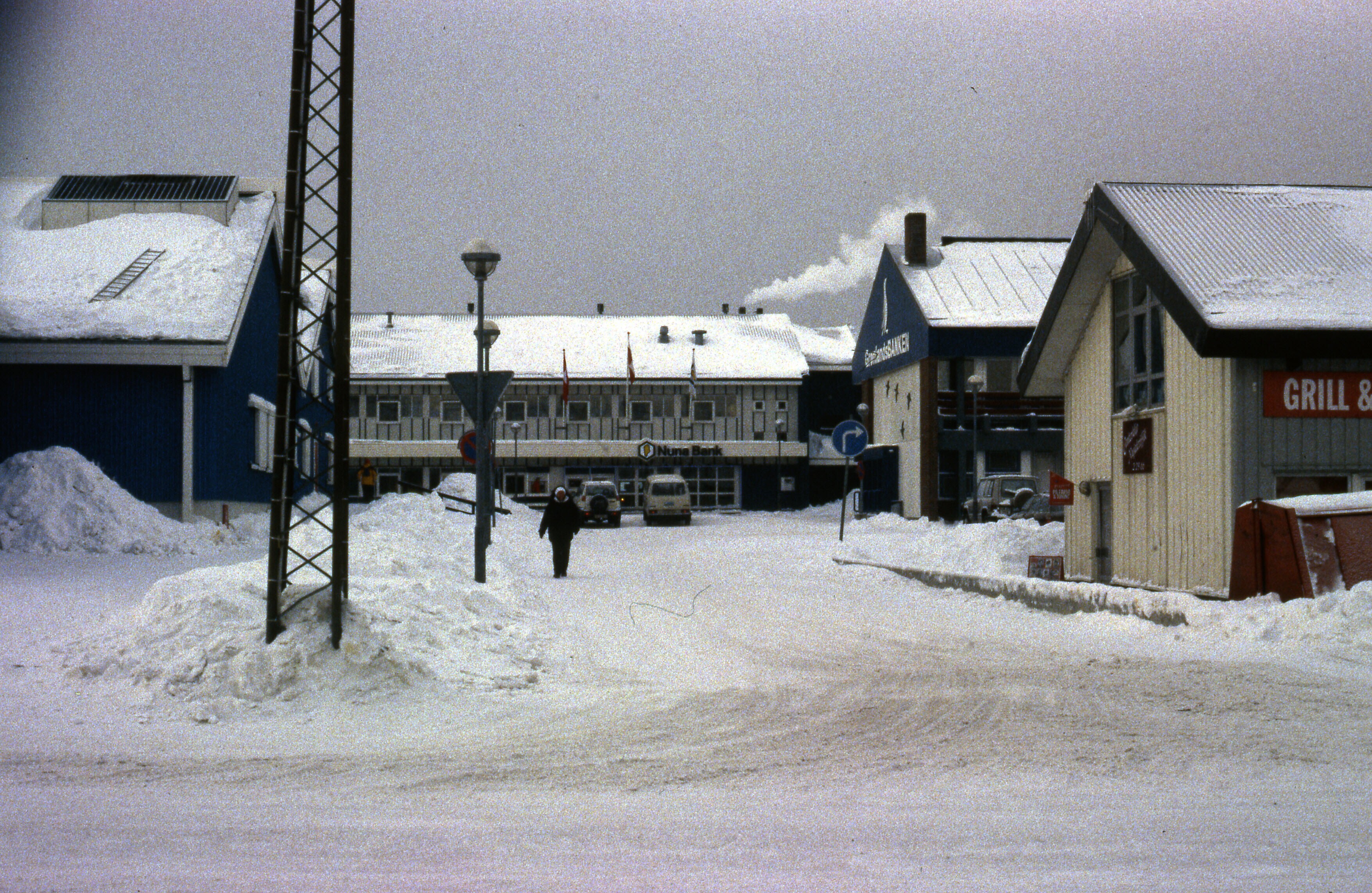 - Het met sneeuw bedekte dorpsplein van Tiniteqilaaq...