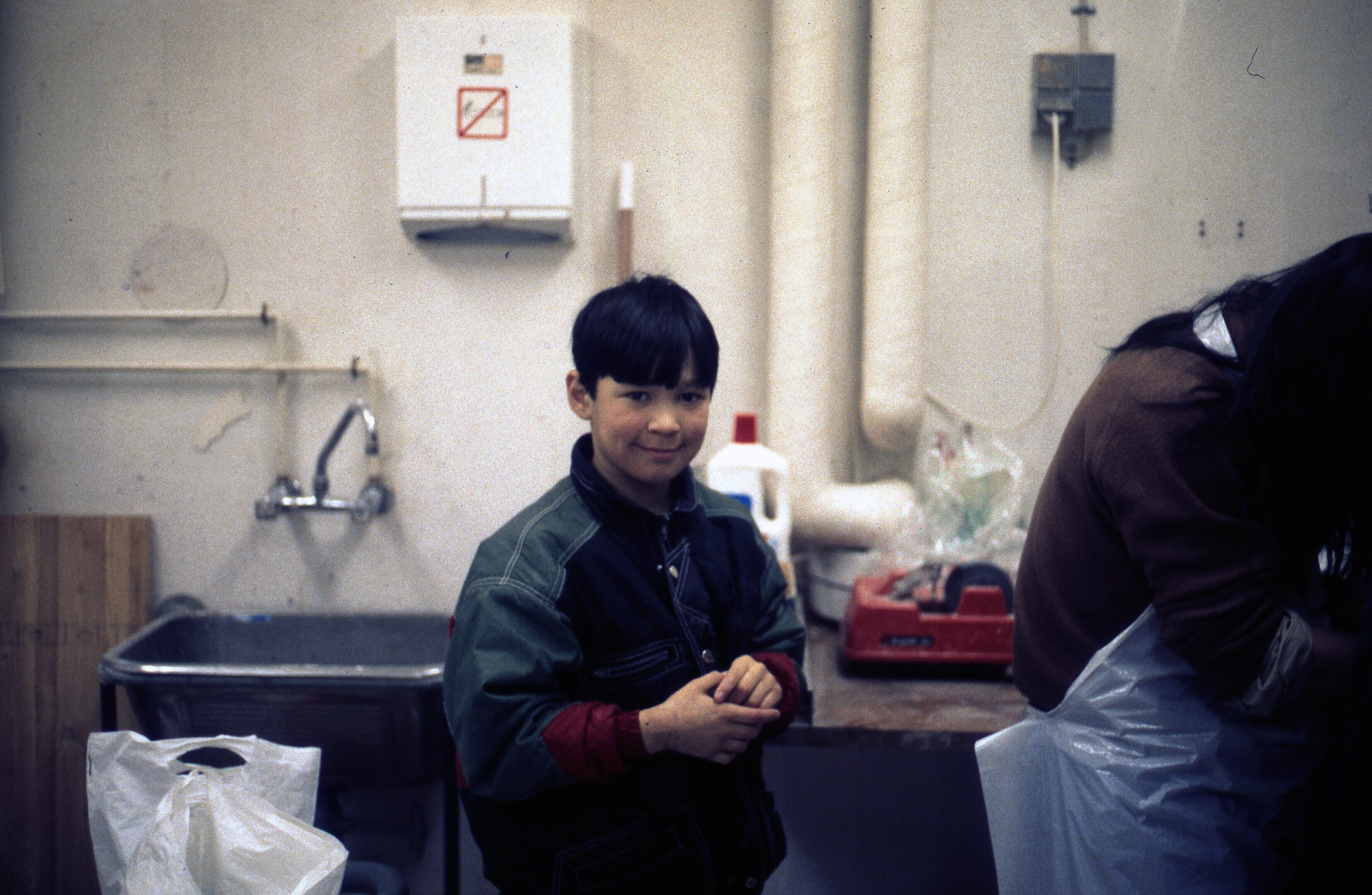 Een Inuit jongen kijkt toe hoe Inuit kunstenaar Per ...