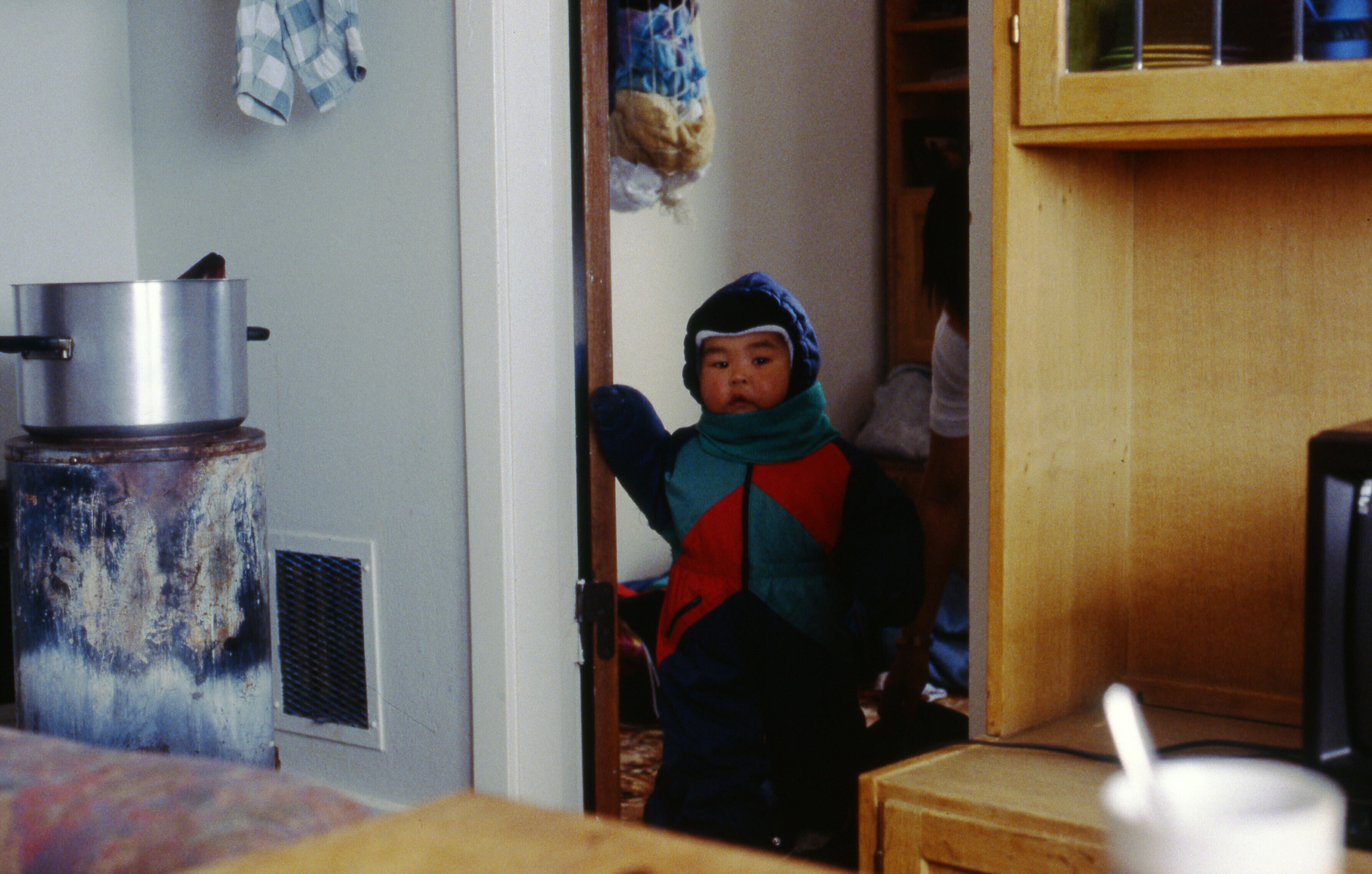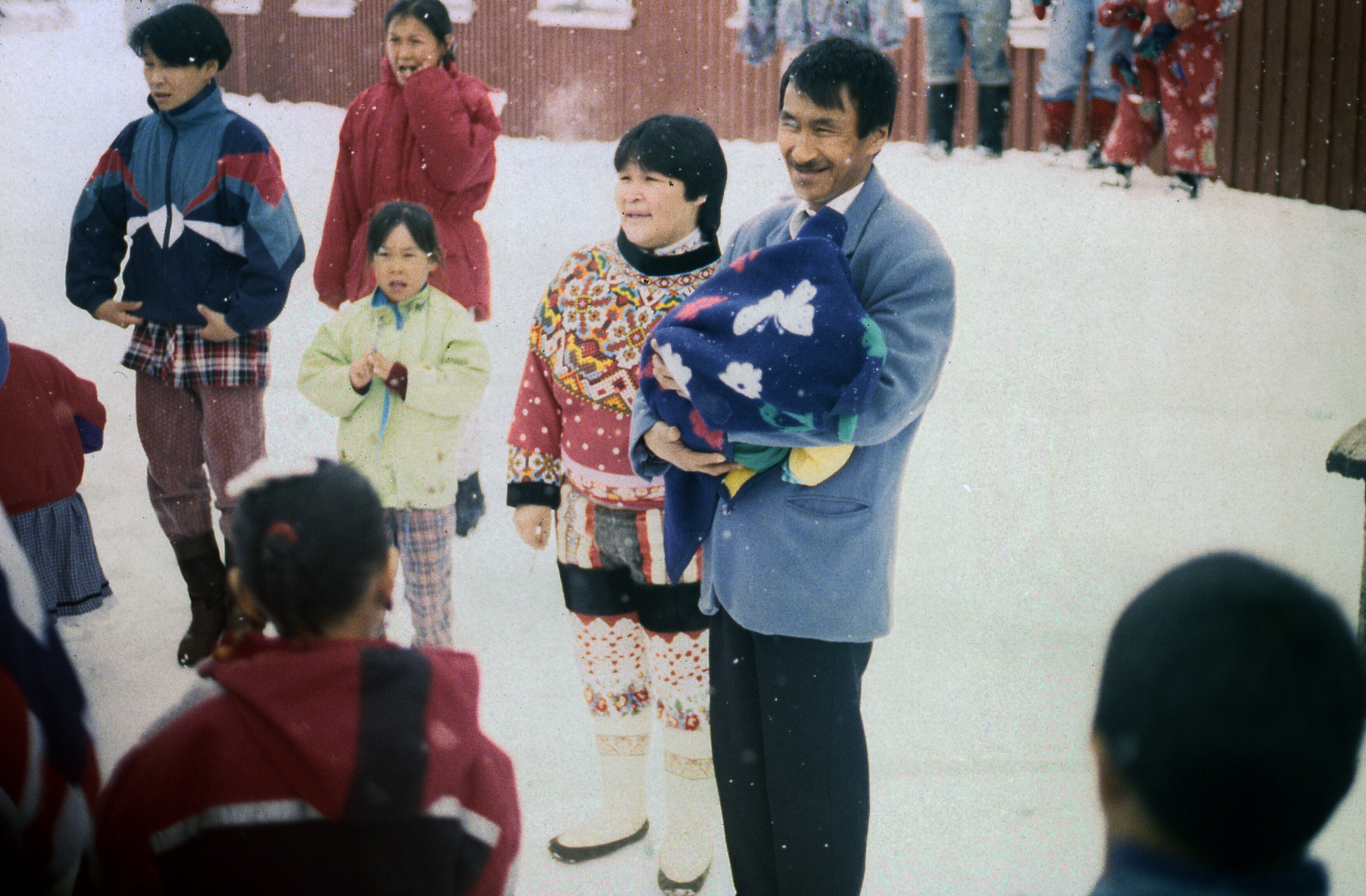 Een Oost-Groenlands kind staat goed aangekleed (in m...